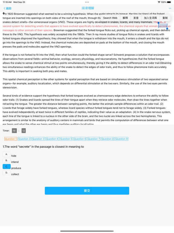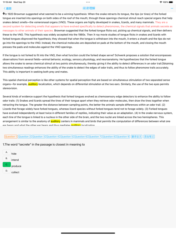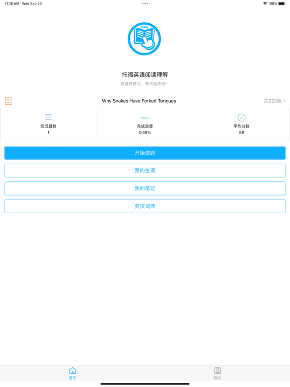 托福英语阅读理解,您的专业托福备考伙伴!我们为您提供了大量官方托福试题和模拟试题,让您在规定时间内进行模拟练习,助您轻松备考托福阅读理解考试。 特色功能: 1. 大量试题资源: - 我们汇集了几百套官方托福试题和模拟试题,确保您能够真实感受到考试环境和难度。 - 题库不断更新,以保持与最新托福考试标准的一致性。 2. 定时模拟练习: - 设定合理的时间限制,模拟真实考试场景,提高您的时间管理能力。 - 跟踪您的练习进展,分析您的强项和薄弱点,以便有针对性地提高。 3. 查看全文翻译: - 在完成练习后,您可以立即查看文章的全文翻译,帮助您理解文章内容和结构。 - 提供详细解析,解释文章中的重要概念和关键信息。 4. 生词库管理: - 遇到陌生单词?将它们轻松加入生词库,随时进行复习和背诵,扩展您的词汇量。 - 生词库也可自动保存您在练习中遇到的生词。 5. 笔记功能: - 您可以在应用内创建和管理阅读理解笔记,帮助您整理思维和总结重要信息。 - 笔记可随时编辑和分享,方便您与其他学习者互相交流。 6. 内置词典: - 您可以随时查询单词,获取详细解释,并可编辑解释,加入自定义内容。 7. 适配iPad和Mac: - 您可以随时在iPad和Mac上做题,共享生词和笔记。 无论您是初学者还是高级托福考生,托福阅读理解都将成为您的得力助手,帮助您实现更高的托福考试分数。