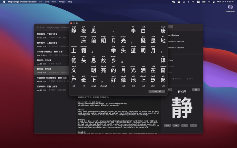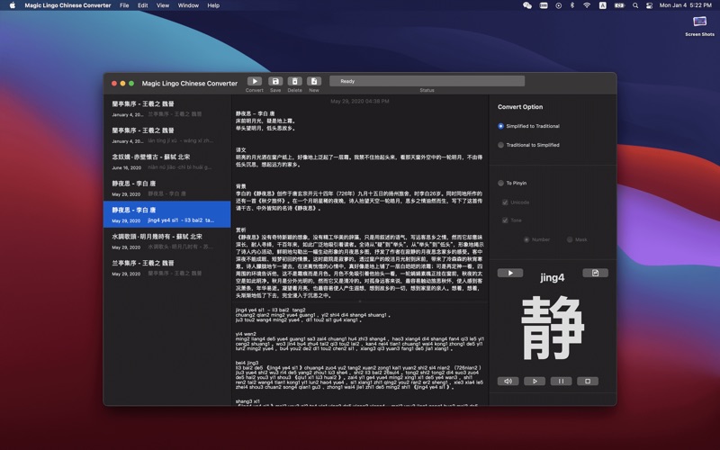 # 程序简介 繁体中文及简体中文转换工具 程序支持繁体中文及简体中文之间的互相转换。同时,支持两种中文转换为拼音,并且支持带声调及 Unicode 编码。 # 功能介绍 - 支持记事本保存功能 - 支持繁体中文 - 支持简体中文 - 支持带声调的拼音声调数字和符号 - 支持拼音的 Unicode 编码 - 支持中文和拼音表格显示 - 中文和拼音表格输出至 PDF 文件 - 支持中文语音阅读发音 增加程序的兼容性