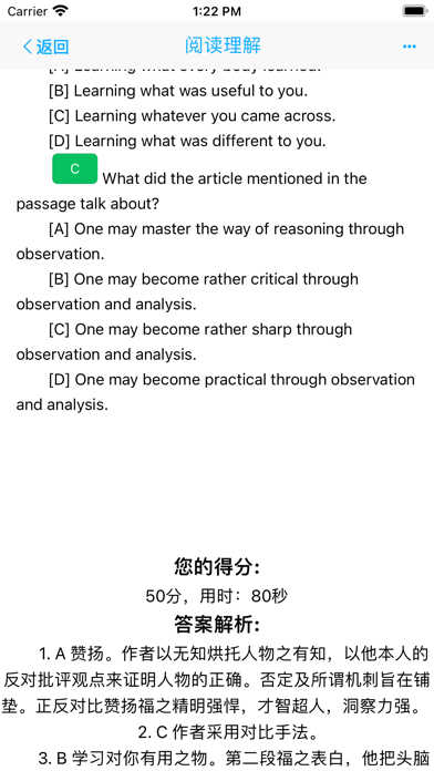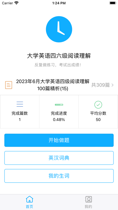 大学英语四六级考试的重点是阅读理解, 只有通过不断地练习做题和积累单词才能提高。本App精选了几百篇大学英语四级和六级阅读理解习题, 在规定时间内模拟真实的考试练习,并配有答案解析。通过做题时把陌生的单词词组加入自定义的生词库反复地复习巩固, 从而扩充词汇量, 提升自己的英语水平,考试时自然能轻松应对!  内置的英汉汉英词典,查询单词更加方便,单词可随时加入生词库,并可编辑生词加入自定义解释。