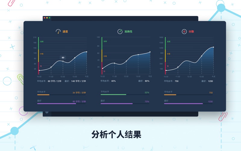 打字大师 3 ---高级版是一个触摸打字课程,同时使用你所有的10个手指掌握快速打字技术。 提高你的打字速度: --练习的多样性:字母和特殊字符、单词和短语。 1、点击设置(左下角)。 2、确保自动难度已关闭。 3、选择难度等级,然后开始上课。 4、使用左/右箭头键选择子课程。 难度设置: 1、点击设置(左下角)。 2、如果您成功地进行了练习,请选择自动难度转到下一堂课。 3、如果你想多次练习这节课中的单词,可以取消自动难度,并选择课程。 检查新的技能: --多级别的考试; --准确的统计结果。 最佳平均速度, 最佳平均准确率 更多的优势: --智能定时器---当你点击应用外窗口时停止。 --接着,你可以随时返回并继续练习。 --排行榜:与其他用户竞争打字速度和准确性,并根据你的技能对自己进行排名。 --3个主题 - 亮,暗和东方 - 选择最方便适合你的主题。 --在窗口之间快速切换和热键; --彩色键盘计划为更好的记忆手指位置; --理想的自学应用---随时随地学习。 可用语言: --英语(QWERTY), --俄语(ЙЦУКЕН), --西班牙语语, --法语(AZERTY), --德语 (QWERTZ), --意大利语。 某些功能只能通过订阅访问,包括所有难度级别、所有文本、打字考试和个性化证书。 免费版本包括完整的初学者级别和每个级别的一节课。