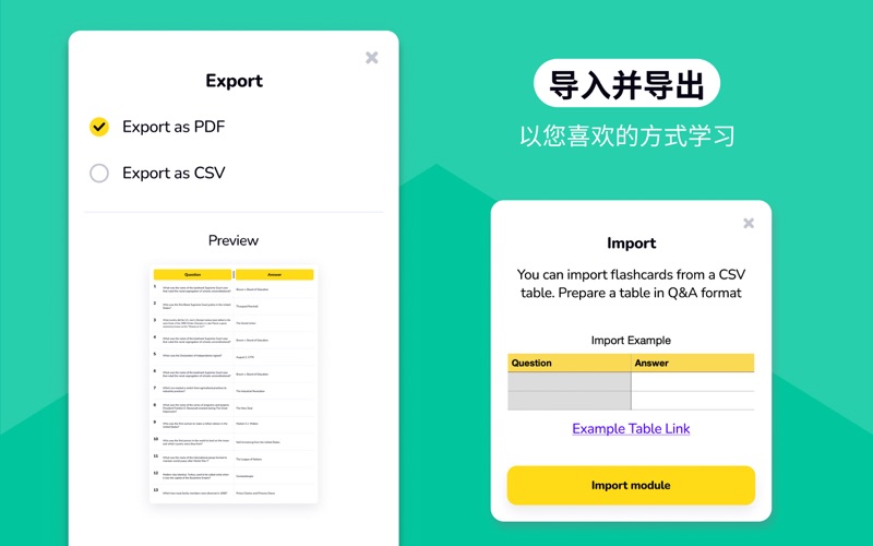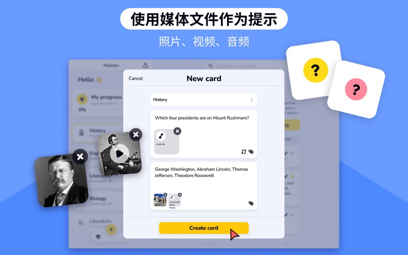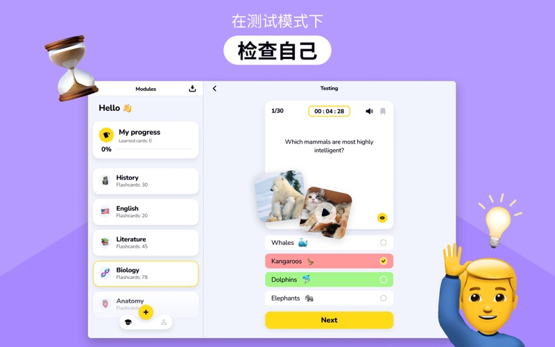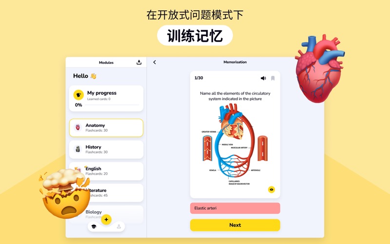 使用AI抽认卡高效地学习并背书! 用人工智能来提高您的知识。 【创建抽认卡】 外语单词、术语、历史日期——所有这些以及更多内容都可以在抽认卡的帮助下方便地学习! 【使用提示】 您可以将照片、音频和视频添加到每张卡片中作为提示或问题的一部分。 【照片学习】 拍摄照片,AI 自动识别物体并提供翻译,快速生成闪卡。通过视觉联想更有效地学习,轻松扩展知识库。 【按主题整理】 将问题分组到学习集,并添加到您应该更多关注的“选择的”卡中。 您还可以上传现成的问答列表,以免浪费时间手动输入。 【记住】 翻转卡片以记住新信息或复习已学内容。 【测试您的知识】 > 测验:从多个答案选项中选择; > 开放式问题:手动输入答案,仅依靠您的记忆。 【导出打印】 所有材料都可以PDF、PNG和CSV格式导出。 重要提示 创建第二个及后续模块、创建超过 15 张卡片、自定义超过 3 张卡片、导出卡片、开放式问题模式以及通过照片生成超过 2 张卡片,均需订阅才能使用。 https://appsprings.pro/privacy https://appsprings.pro/tos 使用我们的新“照片”功能,大幅提升您的学习效率! 拍摄照片,让AI识别物体并提供翻译 – 让制作抽认卡更快、更有效。