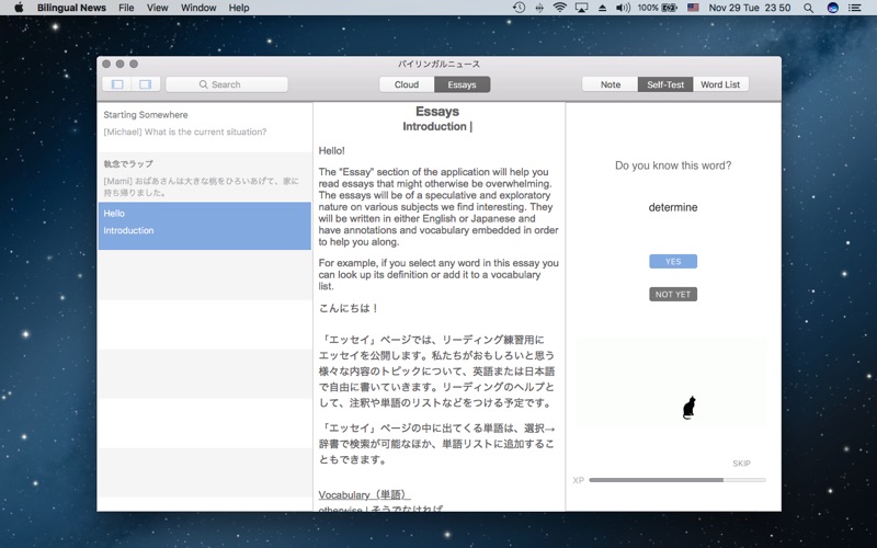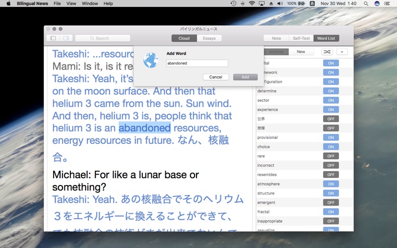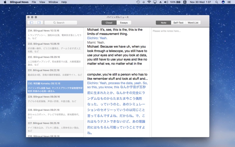 大人気ポッドキャスト番組、バイリンガルニュースの公式アプリ。 番組の内容が、文字起こしテキストになっています。 聞き取れない単語や表現の確認に便利です。知らない単語はアプリ内で辞書検索できるほか、自分だけの単語リストやメモ作成も可能! [バイリンガルニュース] iTunesの無料Podcast。世界のおもしろいニュースを日本語と英語で紹介してうます。マイケルと マミによる台本なし、一発本番のリアルな日英会話をゆるーく配信中! [お試し機能] エピソード1~3の文字起こしは無料です。 [辞書機能] 単語を三本指でタップすると、意味が表示されます。 設定:「システム環境設定」から「トラックパッド」を選択して、「調べる」のチェックをONにします。 [検索機能] 単語の検索が可能です。 [エッセイ] 様々なテーマの書き下ろしエッセイ。部分的な翻訳や単語リストでより理解を深めることができます。 [単語テスト機能] 覚えたい単語を選択すると、単語リストに追加されます。 リストに追加した単語は、フラッシュカード形式の単語テストに出てきます。覚えた単語が増え るごとに、キャラクターが成長していきますのでお楽しみに! [メモ機能] 自由にメモを書き込めます。 [トランスクリプト修理] エラー等でテキストがきちんと表示されない場合は、テキスト修復ボタンを押すと再ダウンロー ドされます。 [印刷] 文字起こしテキストの印刷ができます。集約ページ数4をおすすめします。 [オールアクセス権] 月額240円で、全てのテキストとエッセイの閲覧が可能になります。 iTunesアカウントからの自動引き落としです。 オールアクセス権を解除したい場合は、アカウント設定から行えます。更新の24時間前までのキ ャンセルで、次の月から解除されます。 利用規約 and プライバシーポリシー https://bilingualnews.jp/privacy-policy-mac/ + バグ修正 | bug fixes