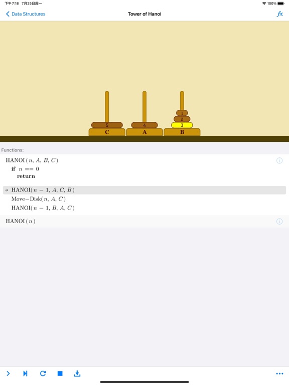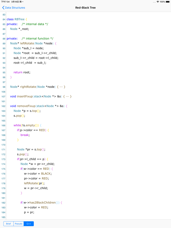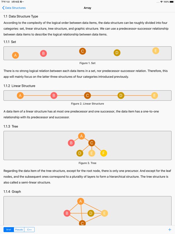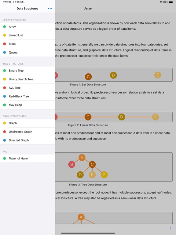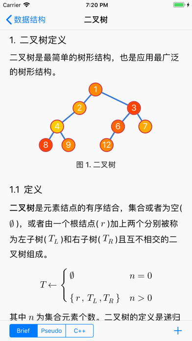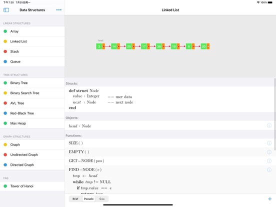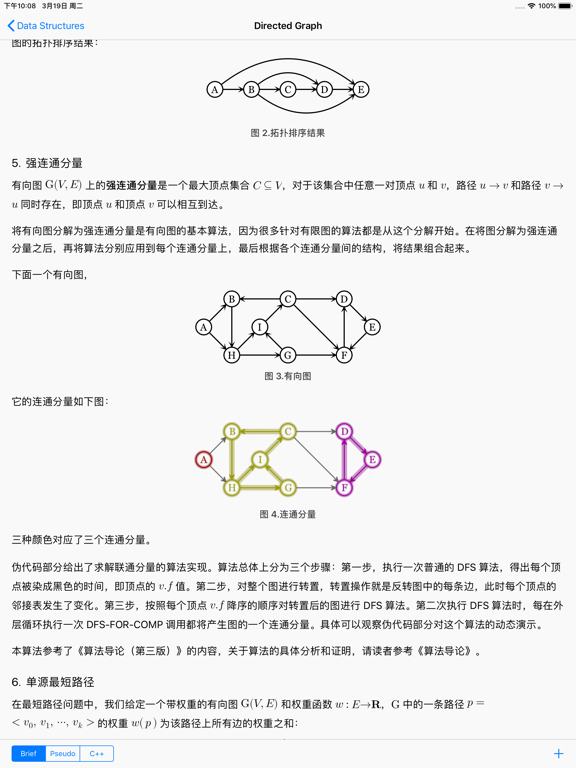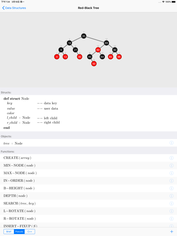 一款新颖的数据结构学习 App,最大的特色是您可以在这个 App 中您可以动态调试数据结构,直观地观察到数据结构在运行过程中的变化。 在这个 App 中您可以学习到以下数据结构: 1、线性结构,包括数组、链表、队列、栈。线性表是其他高级数据结构、以及高级算法的基础。 2、树形结构,包括二叉树、二叉查找树、AVL 树、红黑树、堆结构。您可以在这个 App 中动态调试二叉树的三种遍历(包括遍历的非递归实现),查找树的检索,AVL树和红黑树的平衡调整,以及堆排序算法。让您具备徒手写出红黑树的水平。 3、图结构,包括图结构的邻接链表存储表示,深度优先搜索和广度优先搜索,寻找图结构中的欧拉路径,图结构的拓扑排序,最大连通分量,最小生成树问题,以及单源最短路径问题。并提供了这些经典的图算法的动态调试功能。 4、数据结构入门课都会讲到汉诺塔问题。解决这个问题的算法那往往是递归的。 这个App 中便提供了汉诺塔问题的动态调试,让您对汉诺塔的递归调用不再迷惑。 1、提升了App 稳定性。 2、改进 iPadOS 下的UI界面。