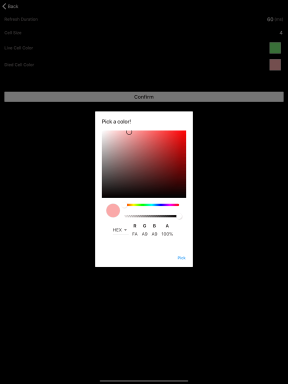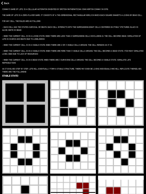 康威生命游戏(英语:Conway's Game of Life),又称康威生命棋,是英国数学家约翰·何顿·康威在1970年发明的细胞自动机。 对于任意细胞,规则如下: - 每个细胞有两种状态 - 存活或死亡,每个细胞与以自身为中心的周围八格细胞产生互动(如图,黑色为存活,白色为死亡) - 当前细胞为存活状态时,当周围的存活细胞低于2个时(不包含2个),该细胞变成死亡状态。(模拟生命数量稀少) - 当前细胞为存活状态时,当周围有2个或3个存活细胞时,该细胞保持原样。 - 当前细胞为存活状态时,当周围有超过3个存活细胞时,该细胞变成死亡状态。(模拟生命数量过多) - 当前细胞为死亡状态时,当周围有3个存活细胞时,该细胞变成存活状态。(模拟繁殖) 可以把最初的细胞结构定义为种子,当所有在种子中的细胞同时被以上规则处理后,可以得到第一代细胞图。按规则继续处理当前的细胞图,可以得到下一代的细胞图,周而复始。 Bug fixed and performance improvements