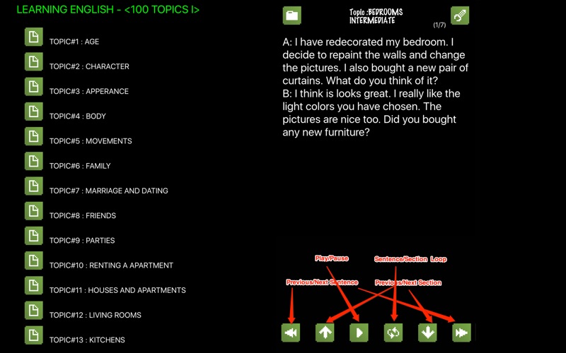 攻克雅思口语 快速精选生活场景100主题+自动切割,按句复读,学英语需要好软件,才能快速提升您的英语口语和听力水平! Topics (主题场景): 1. AGE 2. CHARACTER 3. APPEARANCE 4. BODY 5. MOVEMENTS 6. FAMILY 7. MARRIAGE AND DATING 8. FRIENDS 9. PARTIES 10. RENTING A APARTMENT 11. HOUSES AND APARTMENTS 12. LIVING ROOMS 13. KITCHENS 14. BEDROOMS 15. BATHROOMS 16. HOUSEHOLD APPLIANCES 17. SHOPPING 18. CLOTHES 19. FASHION 20. DIRECTION 21. TELEPHONING 22. BANKS 23. POST OFFICE 24. EATING OUT 25. INSURANCE 26. HEALTH PROBLEMS 27. SEEING THE DOCTOR 28. AT THE HOSPITAL 29. TRAVEL 30. HOTELS 31. TRANSPORT 32. COOKING 33. MEAT AND FISH 34. FRUIT AND VEGETABLE 35. DRINKS AND DESSERTS 36. GAMES 37. FREE TIME ACTIVITIES 38. PETS 39. HEALTH AND FITNESS 40. THE OLYMPICS 41. TRACK AND FIELD EVENTS 42. BALL SPORTS 43. EXTREME SPORTS 44. HOLIDAYS 45. FESTIVALS 46. SPECIAL OCCASIONS 47. SCHOOL 48. EDUCATION 49. TEACHERS 50. STUDYING ABROAD 51. PASSPORT AND VISAS 52. JOBS 53. AT THE OFFICE 54. AT THE WORKING DAY 55. DOING BUSINESS 56. LITERATURE 57. LANGUAGES 58. MUSIC 59. FINE ARTS 60. HISTORY 61. SCIENCE 62. MOVIES 63. TELEVISION 64. SHOW BIZ 65. FANS AND THEIR IDOLS 66. CHATTING ONLINE 67. COMPUTER 68. THE INTERNET AND EMAIL 69. ADVERTISING 70. NEWSPAPER 71. MAGAZINES 72. BOOKS 73. COUNTIES 74. CITIES 75. THE COUNTRYSIDE 76. WAR 77. RELIGION 78. POLITICS 79. SOCIAL PROBLEMS 80. THE WEATHER 81. THE ENVIRONMENT 82. THE SEASONS 83. THE NATURAL WORLD 84. ANIMALS 85. PLANTS 86. NATURAL DISASTERS 87. NATURAL RESOURCES 88. DISTANCE AND SPEED 89. QUANTITIES 90. NUMBERS 91. TIME 92. SIZE AND SHAPE 93. DIRECTIONS 94. MONEY 95. FEELINGS AND EMOTIONS 96. LIKES AND DISLIKES 97. GIVING AND RECEIVING 98. HOPES AND POSSIBILITIES 99. SUGGESTIONS AND REQUESTS 100. EXPRESSING THOUGHTS AND IDEAS 支持快捷键操作: 播放/暂停 按句复读/按片段复读 左/右箭头 : 上/下 句 上/下箭头:上/下 片段 每天坚持,玩转口语! P.S. 因为作者本人也是英语学习者,这款软件是完全按照自己的需求开发的,您只需要每天打开软件,天天坚持重复听小对话的学习效果很好,相信也能帮到你。 Adding 70 topics