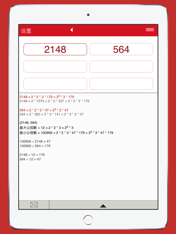质因数分解 程式。 分解质因子。 求最大公约数和最小公倍数。 请输入您需要分解的整数。你可以输入1~ 9 999,999,999。 Input numbers max length increased to 10 digits. Updated app translations. Updated app icon