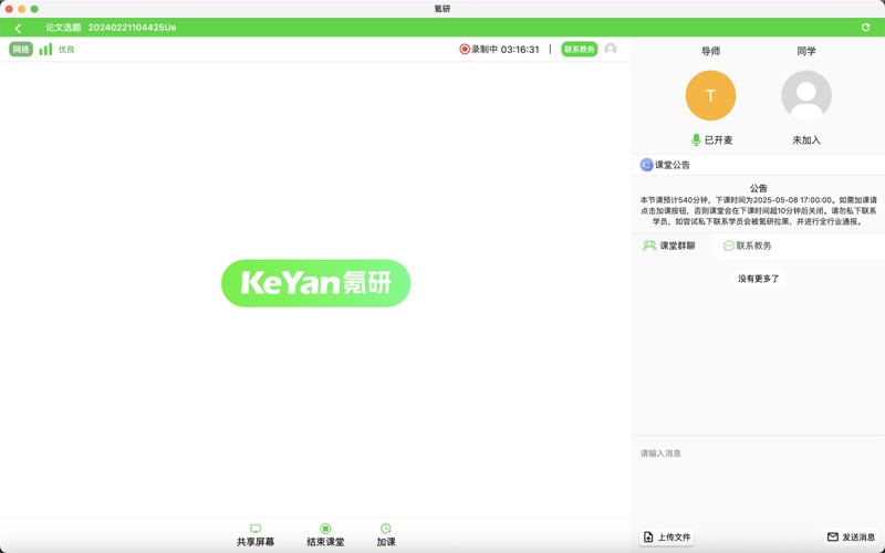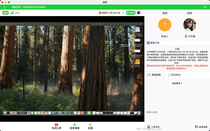 专为课程学员打造的智能化学习和辅导平台,集成课程直播、回放、学习管理、互动协作等功能,支持多场景教学与高效沟通,助力同学老师构建灵活、安全、智能的数字化培训生态平台。 核心功能亮点: 1.课程直播与回放: 支持高清音视频直播、屏幕共享,适配远程授课与会议场景; 自动录制课程并生成回放链接,支持倍速播放、章节标记,员工可随时复习。 2.智能监测和学习追踪: 教务陪同上课监督课程情况,确保课程稳定进行; 实时记录学习时长、课程完成度,生成个人学习记录,支持管理员导出每日上课报告。 3.互动协作工具: 内置聊天框、投屏、私聊工作人员等功能,增强课堂参与感; 支持手机/平板/电脑多端使用,个性划使用场景,方便使用。 4.安全与兼容性 数据加密存储,支持私有化部署,适配企业内部权限管理体系; 多端同步(PC/手机/平板),兼容主流操作系统,低带宽环境下仍流畅运行 修复部分返回黑屏的问题