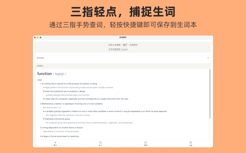 单词捕手是一款专为 macOS 用户打造的生词捕捉、管理与记忆工具。 核心功能: • 快捷捕获 - 通过三指手势查找单词释义,轻按快捷键即可一键保存生词到本地 • 多词典支持 - 除了系统自带词典(部分支持),还支持导入专业MDX格式词典,满足不同学习需求 • 科学复习 - 基于艾宾浩斯遗忘曲线算法,智能安排复习计划,提升记忆效率 • 智能管理 - 强大的生词管理功能,支持搜索、排序、编辑和删除操作 • 学习统计 - 实时追踪复习进度和正确率,让学习效果一目了然 • 纯净体验 - 完全本地运行,保护用户隐私,无需网络也能使用 1. 增加 App Store 评分功能 2. 提升用户体验