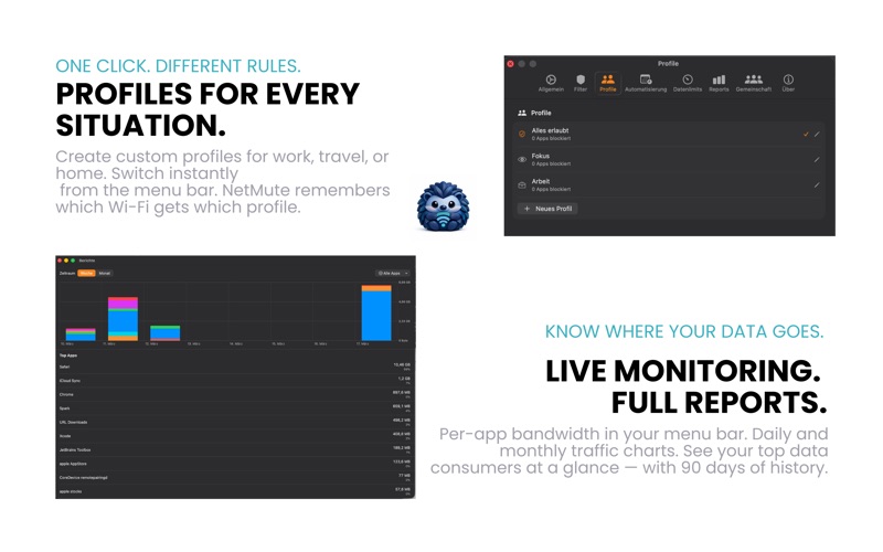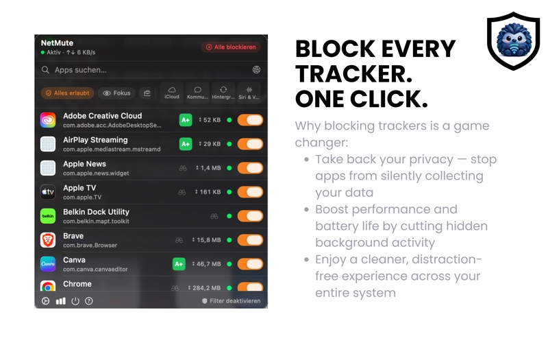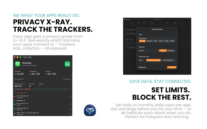 你的应用在后台偷偷与你通讯。天气应用会连接到47个域名--其中包括你从未听说过的广告追踪器。在热点上,这些后台活动会耗尽你的数据。 NetMute 能阻止它们。 - 跟踪器屏蔽:一键阻止 300+ 跟踪器,覆盖所有应用 - 隐私仪表板:查看哪些公司在追踪你,按公司排序 - 应用 X 射线:点击任意应用,查看它联系的域名并打分 - 可控拦截:对单个应用切换网络访问权限 - 数据上限:为应用设定每日/每月上限,热点场景自动生效 - 排程与配置:工作时屏蔽社交应用,Wi‑Fi 自动切换 - 实时监控:按应用的带宽使用,提供 90 天报告 ▸ 100% 本地化 - 无 VPN、无云端、无账户 ▸ 本地AI识别未知跟踪器 ▸ 一次性购买 - 无订阅,永久有效 新功能:跟踪器屏蔽与隐私仪表板 - 跟踪器屏蔽:一键阻止300+ 跟踪器 - 隐私仪表板:查看哪些公司在追踪你 - 公司级拦截:一次屏蔽 Facebook、Google - 智能拦截检测:关键跟踪器自动放行 - 应用 X 射线:内联拦截/允许 - 应用级排除:对单个跟踪器设置例外 - 拦截原因记录:查看被阻止的原因 - 覆盖系统:需确认后解除封锁 - 设置全新:4 个简化标签页