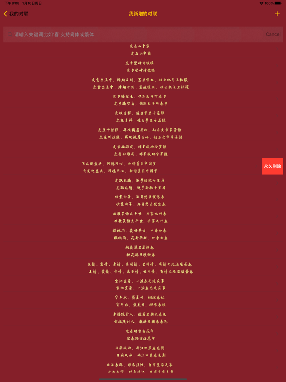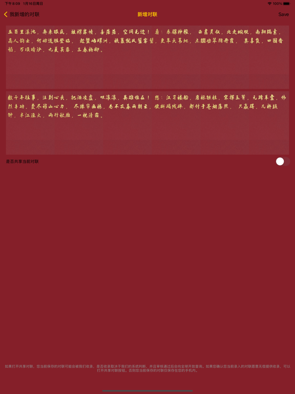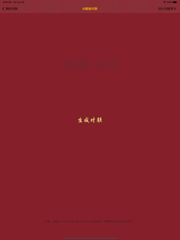 “我的对联”帮助你实现写对联的愿望,逢年过节和亲朋好友分享您的喜悦心情,给兄弟姐妹带去祝福的必备工具。 “我的对联”生成具备你个人特色的对联,你甚至可以使用你的名字生成对联,也可以用你想到的任何句子生成对联。 “我的对联”居于人工智能机器学习的技术实现,目前支持一至十个汉字长度的任意对联生成,你只要输入你想好的上联,她会帮助您在数十万条对联中匹配出下联。 “我的对联”对联不仅可以自动生成对联,同时也支持传统的对联查询,我们提供了数十万对联数据查询,可能是您见过的对联内容最丰富的APP,而且还在持续增加。 “我的对联”支持插入各种节日素材比如灯笼、福字、文字内容等,您可以方便的自由创作对联页面,更灵活的展示分享页面以便分享给亲朋好友。 对联相关知识 对联又称对偶、门对、春贴、春联、对子、桃符、楹联(因古时多悬挂于楼堂宅殿的楹柱而得名)等,是一种对偶文学,起源于桃符。是写在纸、布上或刻在竹子、木头、柱子上的对偶语句。言简意深,对仗工整,平仄协调,字数相同,结构相同,是中文语言的独特的艺术形式。 1:优化设计页面 2:修复部分型号手机添加文字时字体被遮挡的问题