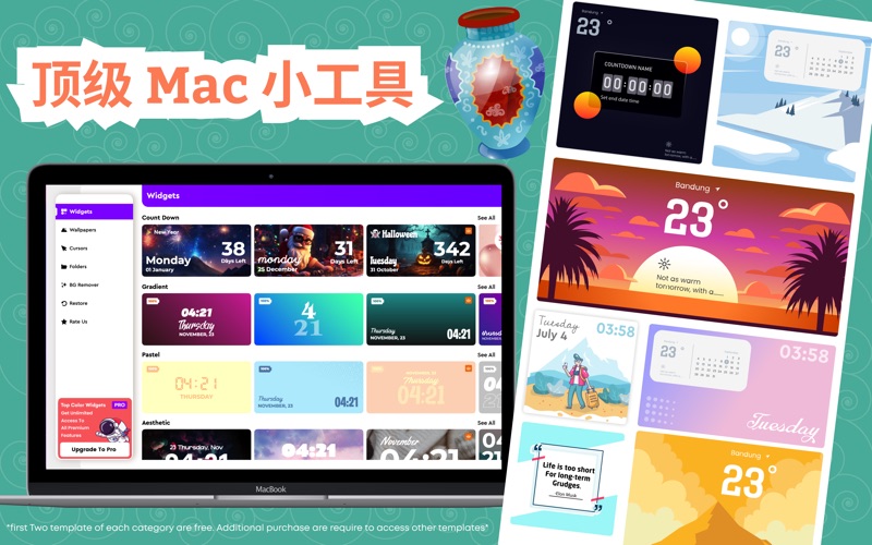 桌面管理器 - Mac 应用程序 桌面管理器应用程序可以帮助您避免因桌面上分散的文件夹而经常面临的混乱。 对于许多人来说,要及时找到所需的文件是相当麻烦的,因为他们的 Mac 桌面从来没有组织过。 这就是推出桌面管理器应用程序的原因,它可以让您的桌面始终井井有条! 凭借一系列出色的主题让您的桌面看起来更美观,您可以按照您想要的方式个性化您的 Mac 主屏幕! 该应用程序允许您从各种选项中选择自定义主题,然后单击一下即可将它们应用到您的主屏幕。 您是否曾在朋友或同事的 Mac 上看到过动画或彩色光标? 如果它引起了您的兴趣并且您想要获得自定义光标,那么无需去其他任何地方,因为这个应用程序已经满足了您的要求! 这款桌面管理器应用程序包含诱人的光标选项,可帮助用户在 Mac 上执行任何任务时保持参与和连接! 事情还没有结束,因为这个桌面管理器应用程序还有更多功能可以提供。 您是否厌倦了桌面上相同的老式文件夹图标? 该应用程序还附带大量的单个文件夹和文件夹包选项,使您有机会选择所需的文件夹布局。 该图标包更换应用程序因其一流的功能而在同类应用程序中脱颖而出。 它们包括以下内容: 桌面管理器为您提供了大量的自定义主题。 其广泛的库包括自定义文件夹、自定义壁纸和背景主题。 这个图标包更换器应用程序为您提供自定义光标的选项。 该小部件应用程序使您可以访问高级小部件套件,其中包含炫酷且时尚的自定义小部件。 桌面管理器应用程序还为您提供 BG 去除器功能,只需单击一下即可帮助您从图像中去除背景。 这个应用程序有一个用户友好的界面,不会让您遇到任何麻烦。 无论您需要将自定义壁纸、主题还是小部件添加到桌面主屏幕,我们的桌面管理器都可以满足您的所有需求。 您可以使用此小部件应用程序中提供的桌面小部件工具来获取有用的内容,而无需访问网站或应用程序。 你还在等什么? 立即在 Mac 上下载桌面管理器,并利用其出色的功能创建自定义桌面主屏幕! 笔记: 每个计划的价格可能会根据用户订阅所在的国家/地区而有所不同。 该计划的实际费用可能会转换为您所居住国家/地区的货币。 确认购买后,付款将记入您的 iTunes 帐户。 除非在当前订阅期结束前至少 24 小时关闭自动续订,否则您的订阅将自动续订。 您的帐户将在当前订阅期结束前 24 小时内收取续订费用。 自动续订的费用与您最初订阅时收取的费用相同。 购买后,您可以前往 App Store 上的帐户设置来管理您的订阅并关闭自动续订。 请阅读我们的服务条款和隐私政策以获取更多信息。 隐私政策: https://www.contentarcade.com/privacy 使用条款: https://www.contentarcade.com/terms Enhanced AI image generator’s performance. Bug fixes.
