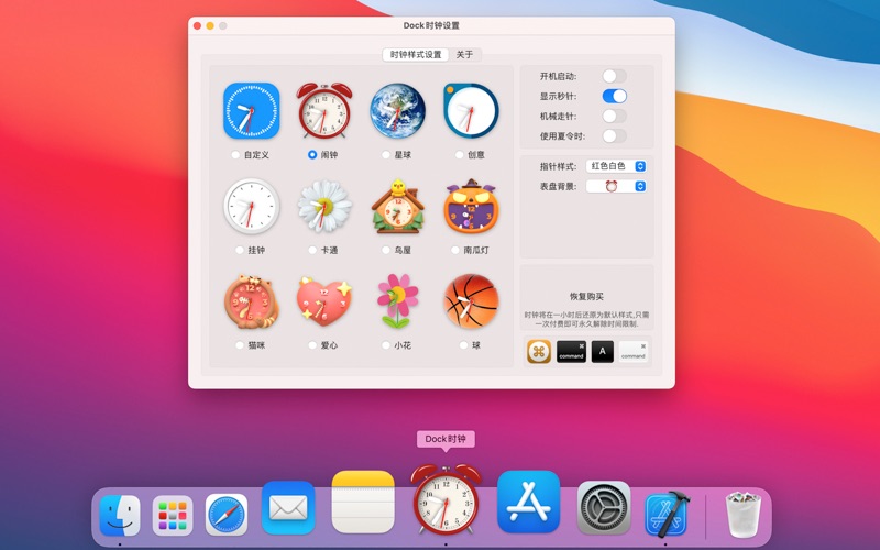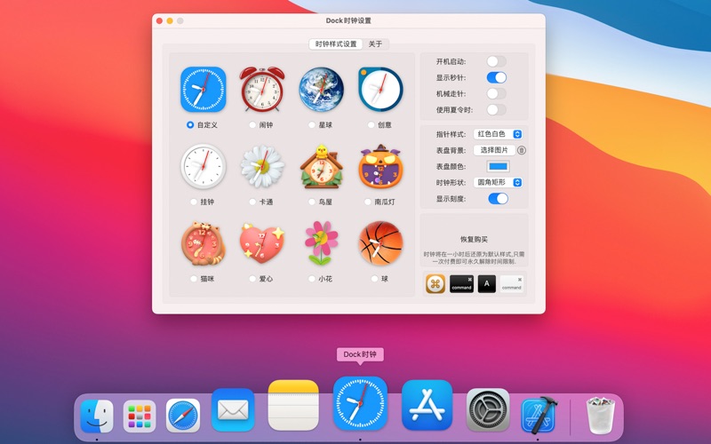【功能介绍】 这是一款可以显示在Dock程序坞上的时钟 它拥有极低的CPU使用率 我们提供了很多很多的显示样式,有经典闹钟、卡通图案、星球、运动球类等等... 另外还特别制作了树屋样式、南瓜灯、可爱的猫咪和爱心表盘样式,总有一个你会喜欢 更多表盘样式持续上线中... 如果您实在找不到喜欢的样式...我们提供自定义样式的功能 你可以把自己家人照片,或自己喜欢的图案作为表盘,放到Dock上显示 时钟的指针还支持机械走针和石英钟走针两种方式,任你挑选 如果你那里正处于夏令时,没问题的 【关于内购】 一次付费可永久使用所有表盘样式 【联系我们】 Email:macostool@qq.com B站:https://space.bilibili.com/404684311 bug fix.