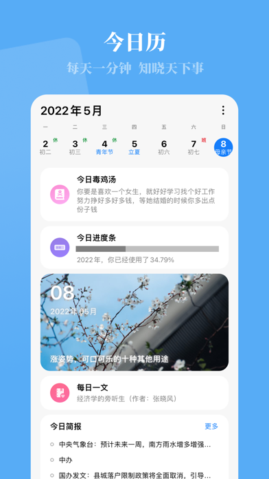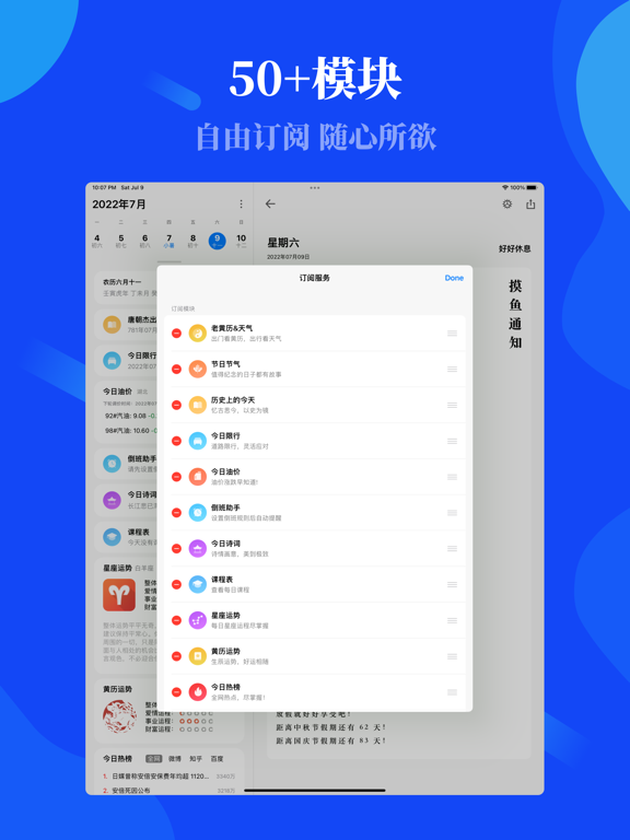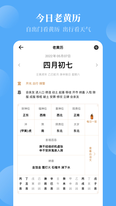 今日历 - 关于今天的一切! 「今日历」是一款专业精美的日历 App,提供老黄历、万年历、历史上的今天、今日限行、今日油价、今日热榜、今日早报、今日晚报……以上目之所及,只是开始。一切,都不会那么简单,一切,都力求简单。是你必不可少的生活助理。 万年历包括但不限皇历、生辰八字、日出月落、农历、黄历、干支、节气、月相、经纬度、节假日、伊斯兰历、儒略历、天文历、回历、西历、佛历、道历、星座、生肖、节日、彭祖百忌、每日宜忌、吉神宜趋、凶煞宜忌、吉神方位、冲煞、纳音、星宿、八字、五行、十神、建除十二值星、青龙名堂等十二神、黄道日及吉凶等等。 「今日历」支持模块: 1. 老黄历 & 天气 2. 程序员老黄历 3. 节日节气 4. 历史上的今天 5. 今日限行 6. 今日油价 7. 倒班助手 8. 经期助手 9. 课程表 10. 星座运势 11. 黄历运势 12. 生活福利 13. 今日有券 14. 今日热榜 15. 今日早报 16. 今日晚报 17. 今日毒鸡汤 18. 今日进度条 19. 我的日程 20. 我的提醒事项 21. 每日一文 22. 今日简报 23. 新闻联播 24. 动态 25. 营销日历 26. 每日壁纸 27. 社会语录 28. 今日诗词 29. 每日一言 30. 彩虹屁 31. 暖男语录 32. 中英文美句 33. 佛历 34. 道历 35. 回历纪年 36. 时辰宜忌 37. 摸鱼通知 38. 灶马头 39. 倒数日 40. 疯狂星期四 41. 太阳系 42. 月球 43. 日出日落 44. 月出月落 45. 董公择日 46. 许真君《玉匣记》 47. 法师选择记 48. 黄帝地母经 49. 孔圣枕中记 50. 物候 51. 天象历 52. 跨境日历 请注意以上[所有模块、所有模块、所有模块]都可以自由订阅或取消订阅,可以仅订阅自己关注的,订阅的模块支持拖动排序。 更多模块需求可以通过建议反馈联系我们添加。 「今日历」建议反馈 我们渴望听到你的反馈,如果你有任何问题或建议,欢迎使用应用内的“互动反馈”功能直接告诉我们,我们会在反馈社区里直接给你回复。 有任何其他想法,也欢迎通过邮件或社交网络平台联系我们,每一条消息我们都会认真阅读。 「访问授权」 今日历 App 经期助手模块需要您授权访问健康 App 经期数据用于展示。 今日历 App 我的日程和我的提醒事项模块需要您授权访问日历和提醒事项数据用于展示。 「HealthKit」 今日历已集成 HealthKit,会自动获取 HealthKit(当然这一切需要用户授权访问) 经期数据用于展示到日历当中。 有关您的隐私和HealthKit数据的重要说明:由于您的健康隐私性非常重要,因此我们默认取消订阅经期助手模块,需要自己添加订阅和授权才能使用。 - 隐私政策:https://www.iappdaily.com/KqndgxeLl9/privacy - 用户协议:https://www.iappdaily.com/KqndgxeLl9/terms 1、修复天气加载失败的bug 2、优化一些UI细节 3、修复一些小bugs
