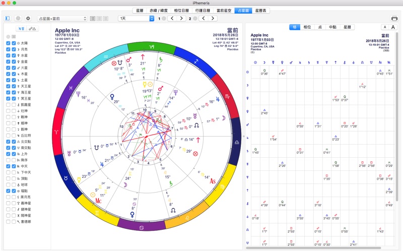MacOS和iOS上最好的占星图和星历工具。包括:出生星图、行运图、推运、复位、太阳返照、配对盘和月书式星历。 - 星历涵盖1700-2099年。可扩展到公元前4700年到公元2995年(7700年)。 - 可定制每月星历表,以显示任何时间和地点。 - 月历样式视图,显示你的数据库中的任何星座的相位和行运。 - 包括“当前星空”,这是一个天文时钟,可在任何位置持续更新。 - 使用iCloud在所有MacOS和iOS设备上的iPhemeris之间备份和共享你的占星图。 占星图功能 • 出生图。 • 行运图。 • 推运。 • 太阳返照。 • 月亮返照。 • 复位。 • 关系图(复合/中点)。 • 日心图和站心图(需要扩展星历)。 • 双盘(2张图)。 • 三盘(3张图)。 • 在图文历上覆盖星座(需要在应用内购买图文历)。 • 相位:0°、30°、36°、40°、45°、51.4°、60°、72°、80°、90°、108°、120°、135°、150°、160°、165°、180°。 • 偏角相位:平行(0°)、反平行(180°)。 • 相位和配对网格。 • 修正工具:时间步长星座在时间上向前和向后。 • 报告:相位网格;相位报告;点、偏角、宫首、元素、交叉和旺弱、中点报告。 • 宫位系统:Placidus、Equal、Koch、Regiomantanus、Campanus、Meridian、Morinus、Porphyry、Topocentric、Whole、吠陀、Alcabitius、白羊宫 0、太阳宫。 • “当前星空”天文时钟。提供世界上任何地方的实时星座(每秒更新一次),并有完整报告。 • 将图存储在iCloud中,并在其他设备上与iPhemeris一起使用。 • 用“标签”对占星图进行分类,并可按名称或标签进行搜索和筛选。 • 自定义:星盘上显示的行星、点、方位及报告。 • 设置独立的容许度,用于应用和分离相位。 • 为星图设计自己的配色方案。 传统占星术 • 报告可以显示传统或现代庙宫。 • 星盘上的星座区间可以显示传统或现代庙宫。 • 可以在星盘上显示界限、期限、极限(埃及或托勒密)。 星历功能 • 星历显示回归或恒星位置,基于JPL DE 431的亚秒精度。 • 地心、日心、站心。 • 经度和赤纬度表。 • 图文星历 - 显示经度和赤纬或谐波。 • 所有行星加上:凯龙星、灶神星、智神星、婚神星、谷神星、恋神星、健神星、义神星、阋神星、塞德娜、火神星。 • 天王星假想天体(8):丘比特、哈迪斯、宙斯、克洛诺斯、阿波罗、阿德梅托斯、武尔坎努斯、波塞冬(需要在应用内购买)。 • 北节点(真实或平均)。 • 行星方向。 • 恒星时间。 • 莉莉丝(黑月亮)。 • 星历时间的月球位置及12小时后。 • 月相和时间(当地时间和格林威治标准时间)。 • 月蚀和日蚀的日期、时间及大小。 • 空亡月相表:包括月亮上一个相位和月亮进入的时间 • 将星历设置为显示任何时间或时区。 • 15个预定义岁差(恒星模式)。 • 定制岁差。 • 选择星历和日历上显示的行星、点、相位和容许度。 • 跳到星历和日历中的任意日期。 • 将星历数据导出为.csv文件,包含纬度、经度、赤纬和速度。 日历 • Aspectarian - 每月月相日历。 • 行运日历 - 任何已保存星图的每月行运日历。 其他功能 • 将星图存储在iCloud中,可在iOS和Mac版本的iPhemeris之间共享。 • 选择配色方案。 地图集和时区 • iPhemeris使用互联网上的国际时区数据库。 • 通过带地址搜索的全球地图查找经度和纬度。 • 手动输入纬度、经度和时区。 有问题请来信:support@iphemeris.com Terms of Service https://www.apple.com/legal/internet-services/itunes/dev/stdeula/ Privacy Policy https://iPhemeris.com 修复了 macOS 26 中控件缺失或无法正常工作的问题