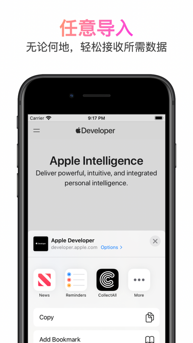CollectAll —— 你的AI智能信息中枢,让数据管理和分析从未如此高效智能 只需轻轻一点,即可极速保存网页、图文、视频、PDF等全格式内容,彻底告别繁琐的收藏过程。同时CollectAll搭载强大的AI引擎,深度解析内容本质,智能提取核心观点和关键数据,自动生成结构清晰、重点突出的内容摘要,通过智能标签和分类,建立信息间的有机联系,将零散碎片转化为系统化的知识网络 无论是工作文档、研究资料,还是灵感素材,CollectAll都能帮你建立专属的智能知识库,让每一份信息都物尽其用。 从即时的信息收集,到深度的知识沉淀,CollectAll正在重新定义高效的知识管理方式。 核心优势: AI智能处理 - 智能内容解析 - 自动提取文本核心观点,生成结构化摘要 - 多模态分析 - 深度解读图片、视频及各类文档中的关键信息 - 精准问答系统 - 基于收藏内容提供准确可靠的智能解答 全格式收藏支持 - 支持网页/文档/图片/视频等格式 - 专业OCR识别,图片文字秒变可编辑文本 - 智能语音转文字,会议录音轻松整理 极致效率体验 - 分享按钮点击即存,收藏过程零干扰 - 剪切板内容智能识别,一键导入重要信息 - 语音速记功能,灵感闪现随时捕捉 无缝数据同步 - 多端实时同步(iPhone/iPad) - iCloud加密备份,数据安全无忧 - 团队协作空间,知识共享更高效 自动续费会员 • 订阅周期:1周(超级会员连续包周产品),1个月(超级会员连续包月产品),12个月(超级会员连续包年产品)。 • 订阅价格:以iAP申请信息为准,例如连续包月产品每月3元,连续包季产品每季12元,连续包年产品每年128元。 • 付款:用户确认购买并付款后记入iTunes账户。 • 取消续订:如需取消续订,请在当前订阅周期到期前 24小时以前,手动在iTunes/Apple ID设置管理中关闭自动续订功能。 • 续订:苹果iTunes账户会在到期前24小时内扣费,扣费成功后订阅周期顺延一个订阅周期。 • 首周免费试用:免费试用期内再次续订或取消续订,不会向用户收回免费试用权益,用户可以继续试用直至试用周期结束。 ◦ 隐私政策:https://separated-scissor-3ac.notion.site/Private-Policy-87a9538767574e0299da30e6b5331abb • 服务条款:https://separated-scissor-3ac.notion.site/Terms-of-Service-14f4c84b0c6b80a08f00cb6f58a01489?pvs=73 作为 CollectAll 的开发者,我真诚希望这款应用能够帮助你进行收集和整理生活中的重要数据。希望你能将 CollectAll 视为你的个人数据中心,并且可以通过AI帮助您更好的分析和解决问题。 这也是我开发这款软件的初衷。如果 CollectAll 真的帮到了你,请为我们留下一个五星好评,或者推荐给你身边的朋友们。我们将继续努力,维护好这款实用的App。 如果你有任何建议或意见,欢迎通过邮件联系我:collectallct@outlook.com。 感谢你的使用! 修改已知问题,优化用户体验