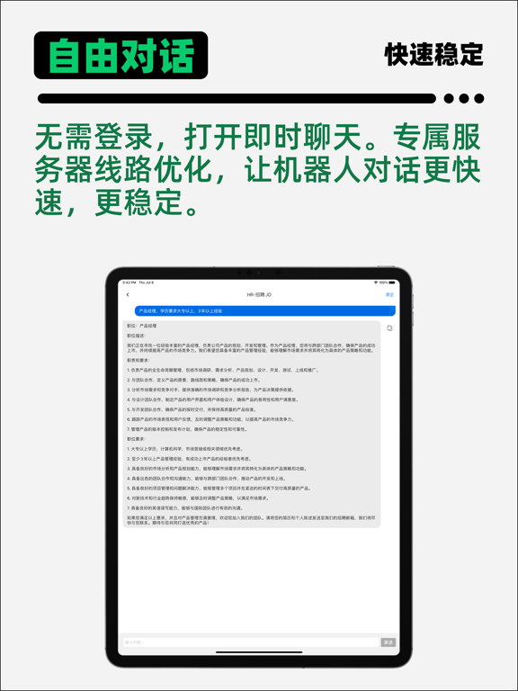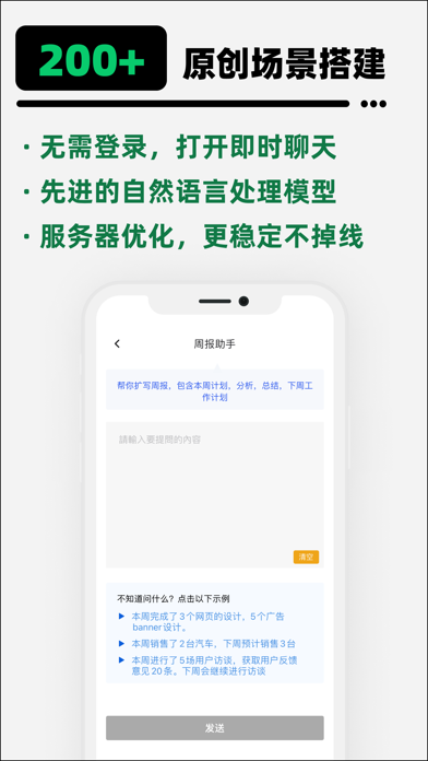 与Chat AI进行对话,您将享受到与真人对话一样的互动体验。它能够理解您的问题,并通过强大的自然语言处理技术,给出详细的解答和建议。无论是学习、工作还是生活中的各种问题,Chat AI都能为您提供及时、热情的帮助。 除了解答疑惑,Chat AI还内置了丰富的中文场景优化的写作提示词库。不论您是在写作文章、撰写邮件,还是进行其他文字创作,Chat AI都能为您提供灵感和指导。它能够提供创意词汇、句式建议,甚至是整段文字的润色建议,让您的文字更加精彩、流畅。 具体来讲,Chat AI设置了以下写作场景: 工作:AI扩写,AI续写,写工作总结,申请书生成器,检讨书生成器,述职报告生成器,心得体会生成器,周报日报月报生成器,演讲稿生成器,头脑风暴,祝福语,口号自我鉴定,各种通知,读后感生成器,方案策划,PPT大纲,Excel助手,写邮件,起草合同,公众号文章生成器,数字转大写,教案生成,期末评语,起名神奇,片段描写,广告语,爆款标题,脚本生产,策划书,MRD助手,BRD助手,招聘JD,宣传稿,主持词,外贸开发信等内容 学习:英文词典,英文文章润色,英文老师,英语对话练习,论文大纲,论文润色,论文翻译,模拟面试,文章续写,数学老师,翻译为中文/英文/日文/韩文/俄语/法语/德语等内容 生活:教你怎么回答小孩子问题,植物养护助手,植物医生,宠物行为讲解员,好评创作等内容 健康:AI导诊医生,心理咨询师,营养师,健康教练,心理健康自评等内容 娱乐:MBTI测试,AI解梦,虚拟女友,虚拟男友,星座运势人生重开模拟器,算姓名等内容 我们还在更新,更多ai创作待你体验 请注意:请勿输入个人信息。此应用提供的内容由AI生成,仅为建议参考,请自行慎重辨别。如您询问的有医疗/法律等专业领域的问题,请一定牢记AI提供的仅为参考,并不构成医疗/法律等专业领域的指导依据,请您在做任何医疗/法律等决定前一定要咨询该方面专家的建议。 订阅服务说明: 如果订购,将从你的iTunes账户扣款。订阅将自动续订,用户可自行进行管理。 如取消,请在当前期限结束前24小时关闭自动续订。如在有效订阅期内,无法取消当前订阅。 使用APP即表示同意用户协议服务条款,隐私协议,付费协议。 用户协议服务条款:https://distinct-xenon-e6f.notion.site/93d5d5363d894708b762de15a0781c9d 隐私政策:https://distinct-xenon-e6f.notion.site/da5354a237744f68bbb0c113a1be0d5e 付费协议:https://distinct-xenon-e6f.notion.site/c6aed59a88ca40e5ac4eec53597ed61d 可以更快速的和AI对话了 增加多语言支持 更多场景