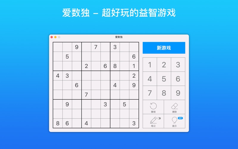 关于数独 流行的日本益智游戏Sudoku基于数字的逻辑位置游戏,数独不需要任何计算或特殊的数学技能;所需要的只是大脑和注意力。 如何玩数独游戏 数独的目标是用数字填充9×9网格,以便每列,行和3×3部分包含1到9之间的数字。在游戏开始时,9×9网格将有一些填写的正方形。你的工作是使用逻辑来填补缺失的数字并完成网格。不要忘记,如果出现以下情况,则移动不正确 *任何行包含多个从1到9的相同数字 *任何列包含多个从1到9的相同数字 *任何3×3网格包含多个相同数字,从1到9 数独提示 一旦你掌握了它,它就是一款有趣的益智游戏。与此同时,学习玩数独游戏对于初学者来说可能有点吓人。所以,如果你是一个完整的初学者,这里有一些数独的技巧,你可以用来提高你的数独技能。 提示1:查找包含5个或更多数字的3×3部分的行,列。完成剩余的空单元格,尝试未使用的数字。在许多情况下,考虑到其行,列和3×3网格中已有的其他数字,您会发现只能放在一个位置的数字。 提示2:将网格划分为3列和3行。每个大列将具有3个,3个3个网格,每行将具有3个,3个3个网格。现在,查找具有相同数字的2的列或网格。从逻辑上讲,在剩余的9个单元格部分中必须有相同数字的第3个副本。查看其余9个位置中的每个位置,看看是否可以找到丢失号码的位置。 本次更新修复了在 macOS 26 上出现的一些兼容性问题,并提升了整体稳定性与性能。