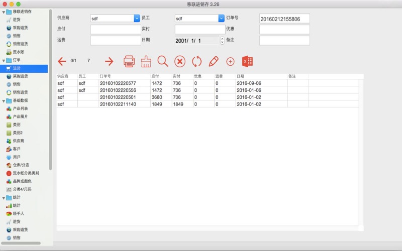 适用于各种零售进货销售管理, 所有商品的零售都支持。如鞋帽 化妆品 建材五金 IT数码电子 食品 医药 医疗器械等 功能强大,操作简单方便。 订单输入有:供应商 客户 经手人 应收 实收 应付实付 优惠 运费 采购输入:仓库 品名型号 条码 颜色 尺码 生产日期 有效期 批次 数量 进货价格 销售价格 单位 选择商品会自动填充 产品分类 品名 条码 价格 日期 批次 等输入过的信息,自动录入,非常快捷方便。 可以管理商品图片 图片上传 删除 看图一目了然 可以导出数据到excel,防止数据丢失 1.进货管理输入产品分类名称条码进货数量进货价销售价单位等信息 可以管理商品图片 可以上传商品图片 展示图片 2.输入条码自动显示名称和价格等信息,查询商品,直接销售。 3.销售管理输入产品条码销售价格客户应收应付等信息,打印销售明细 可以将客户的数据搜索出来然后打印 4.库存管理可以查看每个商品的库存数量和储存位置和各个店铺的库存情况 5.分类管理颜色尺寸 6.管理客户和供应商,自动计算应收和欠款,应收应付统计 7.管理仓库/销售点 库存警报 库存从小到大排列,那些需要进货一目了然 8.管理员工输入员工的相关信息 9.流水帐管理可以记录日常消费,记录每个人的消费总额 10.在流水帐里面可以记录每个员工每个月的工资发放情况 11.统计进货销售和退货情况 12.可以多店铺离线使用 ,联网再上传数据 13.可以离线使用,等连接上网络后再把数据同步到服务器。 (需要购买数据服务) 14.在线登陆后可以将每一步操作同步到服务器。 (需要购买数据服务) 15.一键恢复数据,一键备份数据 该版本是单机版,数据保存在自己电脑上。离线使用, 视频使用教程 http://v.youku.com/v_show/id_XMjcxMTMxMTg1Mg==.html?spm=a2h3j.8428770.3416059.1 deep colour fix