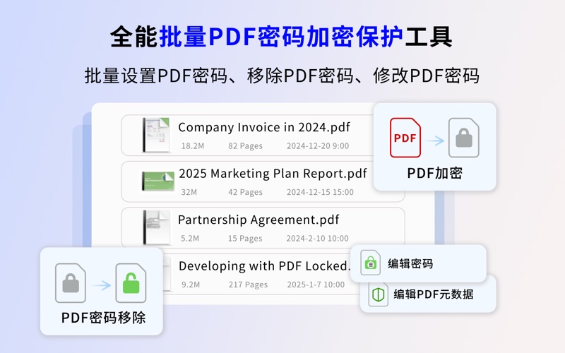 PDF Protector万能PDF加密解密文档安全工具通过密码加密,保护您重要的acrobat PDF文件内容,如机密文件、学术成果、隐私文档等。批量设置PDF文档打开密码和所有者密码,能够保护PDF文件版权,同所有者密码能够设置文档权限,禁止打印和复制PDF文档内容,减少机密信息泄漏的风险。只要您拥有受保护PDF文件的密码,您就可以使用PDF安全保护工具修改PDF密码和权限,编辑PDF安全属性,包括PDF作者,主题,标题和关键字。 此外,PDF安全工具还是一款优秀的Foxit PDF密码移除工具,解除PDF密码,极速删除PDF文件的密码保护。 Foxit PDF加密工具加密的PDF文件适用于其他PDF阅读器和PDF编辑器应用程序,如Adobe Acrobat Reader、WPS PDF、Foxit PDF Editor、Preview等。 • 福昕批量安全保护:极速PDF安全设置,批量加密、删除和修改数百个PDF文档的密码安全和元数据信息 强大的Adobe PDF安全工具 • 使用Adobe标准40位加密和Adobe高级128位加密等级保护PDF文档 • PDF Locker 加密工具设置密码保护PDF文档 • 设置禁止打印PDF文档许可权限 • 设置禁止复制拷贝文档中的文本、图像和其他内容许可权限 • 设置PDF安全属性,修改元数据,如标题、主题作者和关键字等,保护文件版权 • 输入正确的PDF密码就可修改和编辑受保护的PDF文档的权限和密码 • 100%本地处理PDF加密 强大的Adobe PDF保护密码移除工具 • 当您在受保护的文档上输入正确的密码时,PDF密码删除器有助于删除打开的密码并解密PDF保护,移除密码安全性 • 支持移除单个文件或批量多个PDF文件的密码保护 • PDF加密解密安全工具专家-批量添加,移除PDF密码和权限 • 离线加密PDF,修改编辑,删除WPS福昕PDF密码和元数据 PDF标准密码 • 如果您设置一个标准密码,加密和解密 PDF 文件时将自动使用该密码。如果您需要批量加密或者解锁很多拥有相同密码的文档时,您可以来设置这个缺省的默认标准密码,这样您就不需要每次都来输入相同的PDF文档密码了 PDF Security Pro Edition • Edit PDF Encrypt Password, Encrypt and protect PDF Files, Secure PDF Encrypt • Add. Remove and modify PDF password securtty in batch. PDF encryption made easy • PDF Security Pro is fantastic utility to encrypt, add, remove, edit or modify password security of PDFs in batch • SecurePDF Lock : Set Password to PDF, Edit PDF Password Security • Simple and Secure Protection for Your Documents • Lock PDF Pro - Lock and unlock, Protect files and documents, Password protect or unlock your PDFs • Lock PDF & Unlock PDF Offline, Add & Remove Password From PDF • Lock PDF password, PDF Secure : PDF set password Passkeys - Safe • PDF Secure, Lock PDF password : Protect PDF set password Unlock PDF with PDF Password Remover for Free • PDF Password Remover decrypts PDF files and removes PDF restrictions for editing, copying, and printing. By using this PDF unlocker tool, you can effortlessly remove passwords from PDFs with only one click to unlock all the limitations • PDFCrack, Remove open password when you enter the correct password • Remove permission password automatically even you don't know the password • Support remove password protection for a single file or a batch of PDF files • Get direct access to edit, copy, print, and more from secured PDF files • PDF Unlocker - Password Remover, Cracker, Decryption tool & secure tool, PDF Decryption, manage password • Open password-protected or encryption PDF file in a few taps • PDF Restrictions Remover, Export & share unlocked PDF document • Omni PDF Unlocker - Password, Remove PDF password easily • Note: This app does not require any internet connection while unlocking the PDF files. PDF Protector Standard Password • Since PDF Protector uses standard PDF functions, it works perfectly with other PDF applications. If you have to to encrypt or decrypt a lot of documents with the same password, you can set a default password to be used by PDF Protector • Possibility to remember and use a standard password. PDF Metadata Editor • PDF Attribute Editor : Add, Modify, Remove or Edit PDF Title, PDF Author, PDF Subject, PDF Creator and PDF Keywords in batches • Support batch mode to edit a collection of PDF files' attribute in one time • Standalone application-it doesn’t need Adobe Acrobat or other software to Edit PDF attributes 易于使用 • 多种方式添加PDF文件,以设置PDF文件应用安全性:简单的拖放操作,添加文件和添加文件夹 • 对列表中选定的PDF文档或所有PDF文档进行批量加密或密码移除 • 简洁的应用界面和友好的操作 为什么要保护PDF? Adobe PDF安全保护工具允许为文档指定访问权限和密码,包括所有者密码和打开密码。设置打开密码可以防止其他人未经授权访问和查看PDF内容。设置所有者密码可以限制其他人打印和复制PDF文档的内容。 PDF Encryptor文档安全管理工具为用户提供了不同的加密安全等级:128 位 RC4 加密文档、128-bit AES和128-bit RC4。 更多 • 永久许可证,一次性购买 • 升级一次,享受所有功能 • 100%免费更新 • 快速的技术和客户支持响应 学生、老师、开源项目贡献者可免费获取最新的 万能PDF加密解密安全保护工具 专业版 万能PDF加密解密安全保护工具是一款专业的批量Adobe PDF密码保护和权限设置安全工具,支持AES等算法密码加密PDF文档保护、极速删除PDF密码与权限、重复多次编辑修改PDF密码与权限、更改Foxit福昕PDF元数据,如标题、作者、关键字等。离线,无限WPS PDF密码移除,修改,破解等。PDF加密助手和解密工具。无订阅,一次性买断 不断完善PDF Protector PDF安全加密工具是我们对您的承诺。若您有任何