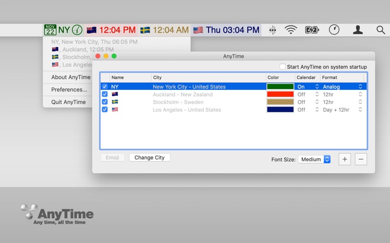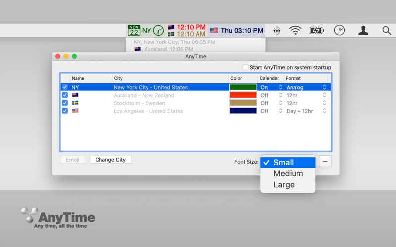 Mac的彩色编码任务栏时钟 在您的任务栏放置多个时钟。现在您可以同时查看多个时区。颜色编码选项可便捷的进行设置。是国际办公的理想选择。 功能 -总是在您的任务栏中(菜单栏) -彩色编码选项 -可以同时显示6个时钟 -不会妨碍您的电脑进入休眠模式 -登陆选项中可选择自动启动 小错误已修复。