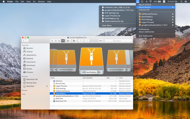 ZipMounter 可以将档案文件(压缩文档、打包文件等)当作本地磁盘一样挂载到 Mac 系统中。 挂载档案文件后,可在 Finder(访达)中打开档案文件(zip, rar, 7-zip, gzip, tar, bz2, 等)并浏览其中内容,像对待插入到电脑上的移动硬盘一样操作。 * 功能特性 • 将档案文件作为本地磁盘/卷挂载到系统中 • 无需解压即可浏览档案文件的目录结构 • 像普通文件一样预览/打开档案文件中包含的文件 • 与 Finder(访达)无缝集成 • 支持 zip, rar, 7-zip, gzip, tar, bz2, xz, cab 等,以及许多其他压缩/打包文件格式 * 常见问题 问:怎样挂载档案文件? 答:可通过以下3中途径挂载档案文件: 1. 在打开的 Finder 窗口中,于档案文件上点击右键 -> 打开方式 -> ZipMounter。 2. 或者,点击菜单栏中的 ZipMounter 图标,选择“挂载档案文件”。 3. 或者,将一个或多个档案文件拖放至菜单栏中的 ZipMounter 图标。 问:ZipMounter 精简版与专业版有何不同? 答:ZipMounter 精简版 每次仅支持挂载一个档案文件,ZipMounter 专业版 可同时挂载多个档案文件。 * 支持 期待您的反馈: https://langui.net/zipmounter/ • 应用图标适配 macOS Tahoe 26