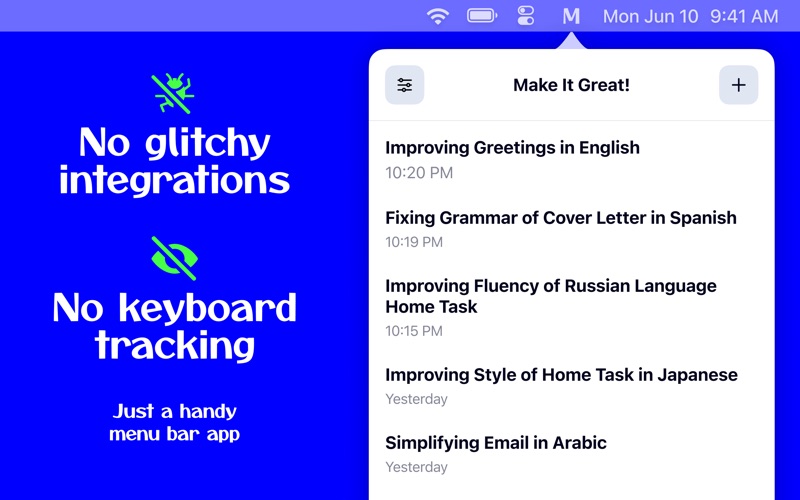 Make It Great! 是一款帮助您用任何语言正确写作的应用。非常适合学生、跨国公司员工以及任何使用外语交流的人。这款应用注重安全性:它不会集成到文本编辑器、电子邮件或即时通讯软件中,也不会跟踪您的键盘输入。 Make It Great! 使用人工智能检查语法和自然度,解释错误,并帮助您学习。 功能特点 (需要订阅) — 使用AI检查任何语言的语法和风格 — 解释每一处修正 — 翻译成任何语言 — 改变文本风格和长度 — 解释语言规则 — 始终可从菜单栏访问 — 不嵌入其他应用或跟踪键盘 快来试试吧! 使用条款和隐私政策: https://make-it-great.webflow.io/terms-privacy 修复了本地化错误和其他一些错误