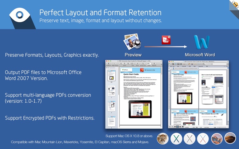 众所周知,将PDF转换为MS Office格式极具挑战性,但我们在格式和内容保存方面提供了无与伦比的准确性! === 离线转换,无需互联网,无需上传,无需无聊等待,隐私安全,100%在本地Mac上处理 === Flyingbee PDF to Word Pro可将PDF文件导出为完全格式化和可编辑的office Word文档,其中保留了原始文本、图像、布局、超链接、表格和bezier图形。 主要特点: +令人难以置信的易用性。 +专业PDF转换器。 +一次添加无限PDF。 +直接将PDF文件转换为完全格式化和可编辑的Word(.docx)文档。 +100%本地转换过程。 +将PDF导出为Word(.docx)、文本(.txt)、RTF(.RTF)和HTML(.HTML)文件。 +升级以解锁所有输出格式,如Microsoft Office(Word、Excel、PPT)、JPEG图像等常见格式和PDF编辑工具。 >使用起来非常简单 简单的工作流程,界面非常整洁清晰。 • 用户友好方便的界面。 • 通过拖放操作方便导入PDF。 • 在应用程序中预览一批PDF文件。 • 一键批量转换PDF。 • 轻松编辑或重复使用PDF内容。 >高效率和生产力 导入任意数量的PDF,以便灵活转换任何特定页面。 • 通过浏览、拖放和在中打开添加PDF的3种方法。 • 通过内置的插入、重新排列、删除和打开功能轻松管理PDF。 • 配置任何特定页面(例如1、2、16、35或所有页面)以满足您的需求。 • 本地处理PDF文件的速度达到100%。 >完美的准确性和布局,格式保留 所有元素,包括文本、图像、格式等,都将保存在Word文档中。 • 准确保留原始文本、图像、布局、超链接、表格和图形。 • 保留笔划或归档矢量图形,包括线条、箭头、矩形和贝塞尔曲线路径。 • 转换带有复制和打印限制的加密PDF。 • 将Adobe PDF转换为多种语言和1.0-1.7版本 • 将PDF文件输出到Office 2007版本(.docx),该版本可以在2007年和最新的Office应用程序之前打开。 >还有更多… 与我们的支持专家和其他产品会面。 • 100%免费更新。 • 快速电子邮件和Skype支持响应。 • 与Mac OS X 10.13-macOS 26.X或更高版本完全兼容。 • 查看适用于iPhone、iPad和Mac设备的PDF转Word。 ***注:**** • 此版本不支持OCR功能。扫描的PDF文件将被提取为Word文档中的图像,但是,我们建议您使用其他专业OCR应用程序从图像中识别可编辑的文本。 • 我们正在不断开发这款应用程序,如有任何疑问、建议或问题,请随时与我们联系。我们会尽快回复。 兼容多种办公套件,例如 Microsoft Office、WPS Office、MobiDocs、Polaris Office 和 LibreOffice。 提升转换速度 重构 PDF C++ 转换引擎 支持 macOS 26 Tahoe 系统 ------------ 需要 macOS 10.13 或更高版本,欢迎联系我们:support@flyingbee.com