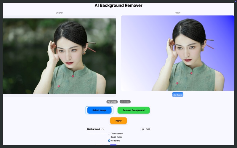 一款专为macOS用户打造的智能图片背景去除与编辑工具。无论是电商图片、证件照、社交头像还是创意设计,AI智能抠图都能帮您轻松实现专业级抠图与美化。 主要功能 一键智能去背景 • 采用先进AI模型(U²-Net),自动检测并精准分割人物或物体。 • 轻松生成透明背景图片。 多种背景替换选项 • 透明背景:导出为无背景PNG。 • 纯色背景:可自定义任意颜色。 • 渐变背景:选择渐变色提升图片质感。 •(可扩展:支持自定义图片背景) 强大的图片编辑工具 • 边缘平滑,抠图更干净 • 亮度、对比度、饱和度、曝光、伽马、色调、鲜明度等多项微调 • 多种模糊效果:高斯、方框、运动、缩放等 • 一键特效:反色、黑白、复古、艺术滤镜 实时预览与调整 • 所有编辑均实时预览,所见即所得。 撤销/重做 • 支持多步撤销与重做,编辑更安心。 高质量导出 • 一键导出PNG格式 • 适用于电商、平面设计、商务演示等场景 bug fixes