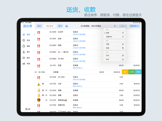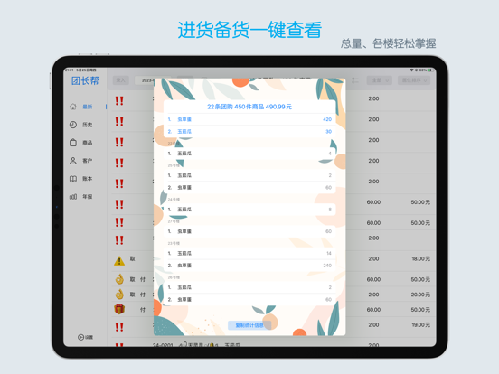 作为社区团购的团长,您是否还在手动统计总共需要进多少货?客户来取货时经常拿不全?送货时不知道从何送起?挨个计算每个顾客需要收多少钱?一天赚多少钱是笔糊涂账?团长帮轻松帮您搞定! 主要功能: 1,把多处的数据统一管理,减少客户取货时少取漏拿。 2,简单几步,轻松录入数据:支持单商品接龙,多商品接龙,单条团购的录入。以及快团团和逮捕新鲜报表导入。 3,自动统计商品销售数量,方便进货。 4,自动统计每楼待送货商品数量,方便备货。 5,可根据居住楼号楼层自动排序,方便送货。 6,自动统计每人的待付款金额,方便收款。 7,可过滤显示已付/未付款,已送/未送货客户,以及按楼号过滤方便收款和送货。 8,支持德佟标签打印机:可以把商品价格等信息打印标签,可一条团购一签,也可以按人打印(单人购买多种商品)。 9,长截图功能:方便截取整个购物名单,提醒大家取货。 10,账单:对顾客没付款项生成账单截图,可以直接通过微信等形式发送账单图片给顾客。 11,账本:自动记录每个团购的每项商品的销售额和数量,只需手动修改进货金额即可查看盈亏。 12,年度报表:流水、利润轻松掌握。 13,客户管理:录入团购数据时自动录入客户,建议手动添加地址信息方便排序。 14,客户排行:每个客户的订单数量和消费金额排名,助您更懂客户。 15,商品管理:录入团购数据时自动录入商品,当需要批量修改当前团购某商品价格时,商品管理中修改即可。 16,Mac,iPhone,iPad数据通过iCloud自动/手动同步,在家用Mac更清晰,出门送货带手机更方便。 客服: QQ:313503033(QQ请打开咨询/添加好友) 微信/手机:18618386446 Email:cs@funbean.cn 有使用问题,使用不便欢迎来撩! ~~~~~~~~~~~~~~~ 每个团购低于60条的用户免费使用。 VIP会员订阅 VIP会员连续包年:订购后单个团购最大100条,使用所有功能,按年付费。 · 订阅周期一年 · 订阅价格:48元/年 · 新用户可以免费使用2周。 SVIP会员连续包年:订购后单个团购最大500条,使用所有功能,按年付费。 · 订阅周期一年 · 订阅价格:98元/年 · 新用户可以免费使用2周。 * 付款:提示购买后,用户选择确定购买,验证用户账户信息提示购买成功后计入用户账号。 * 取消订阅:请在订阅到期前24小时以前,手动在iTunes/Apple ID设置管理中关闭自动续订。 * 会在到期前24小时内扣款,扣款成功后订阅周期顺延一年 * Mac和iPhone,iPad一处购买,全部可以使用。购买后,在其他的新设备请点恢复购买。 ~~~~~~~~~~~~~~~ 隐私政策:https://www.funbean.cn/?docs=the-privacy-policy/zh 服务协议:https://www.funbean.cn/?docs=service-agreement/zh 优化产品细节。。。