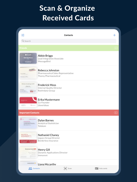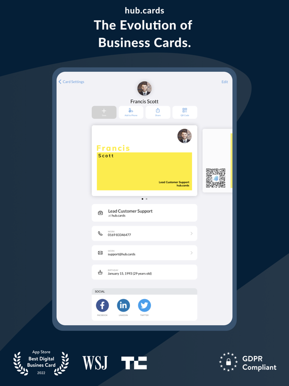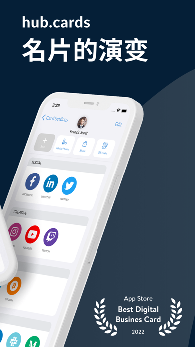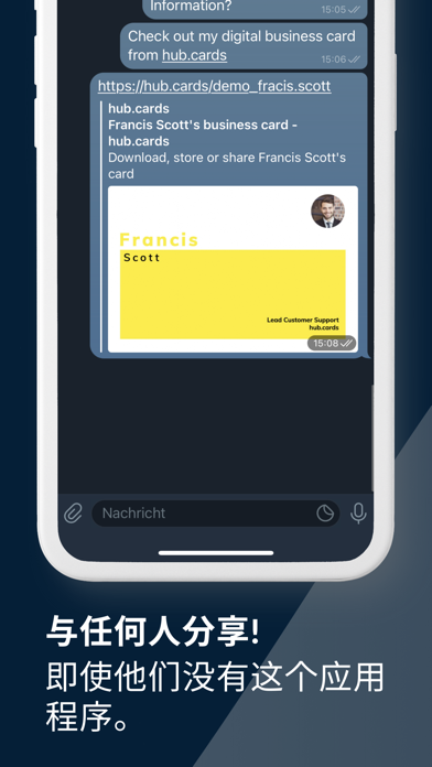 hub.card是数字名片,既可以在数字上使用,也可以在纸上使用。只需扫描您当前的名片,并将其带入数字世界。有了它,你可以将你的所有账户,如LinkedIn或Instagram链接到你的名片上。如果你在网上分享它(通过二维码,电子邮件或Whatsapp),你的收件人将始终得到你的最新信息。 数字时代的数字克隆 通过上传,设计或创建您的名片在hub.card上,您的名片的数字克隆创建与自定义短网址,使其从任何设备访问。这样一来,您可以轻松地分享您的名片,将其嵌入数字媒体,控制和更新您的数据,并跟踪其性能。但最棒的是,您将使所有收卡人的生活更加轻松。没有麻烦的数字化你的卡意味着没有借口丢失它。 传播你的名片,像以前一样 即使你没有带着名片,hub.card也不会让你失望。通过二维码分发您的数字名片,或通过Whatsapp等任何应用程序或通过邮件发送链接。 快速、可靠地扫描传统名片 仅仅一周后,80%的名片最终都会被扔进垃圾桶。他们中的大多数人在之前没有数字化,所以失去了不必要的联系。 在hub.card之前,将名片数字化是很烦人的工作。现在,在现代机器学习算法的帮助下,你可以轻松捕捉收到的名片,并将其内容数字化。 随时随地访问联系人 有了 hub.card,您的所有联系人都存储在我们加密的现代云端,您可以在任何设备上随时访问它们。这样一来,您可以在路上、在办公室或在家里对您的联系人进行分组、分类、过滤和搜索。 服务条款 https://hub.cards/zh/static/terms 隐私政策 https://hub.cards/static/privacy - General bug fixes and improvements We work hard to bring you the best version of hub.cards. That's why we are constantly improving performance, fixing bugs, and making the app a little better with every update.