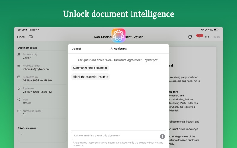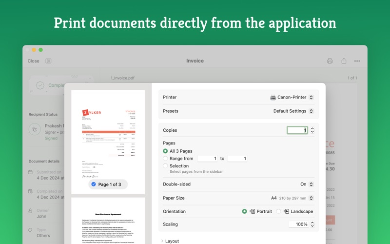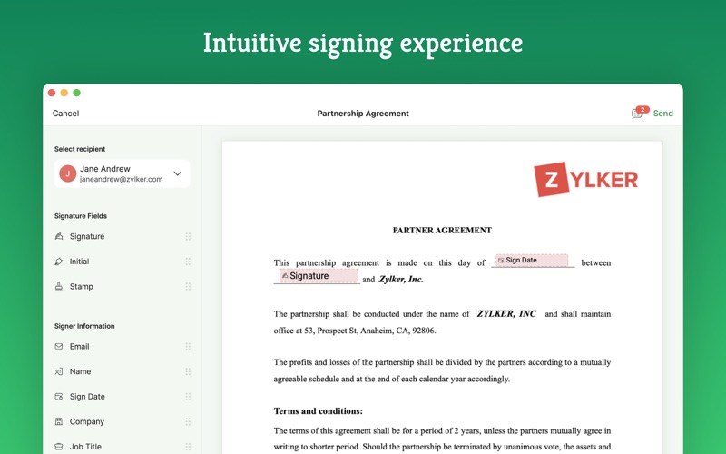 Zoho Sign 是一项数字签名服务,让您可以快速执行合同,省去运输纸质文档的麻烦,同时确保安全和合法。它完全适合云端且已与您的日常应用集成在一起,实现完全无缝的签名体验。 Zoho Sign 完全适合需要签署商业文档的任何人,广泛应用于人力资源、法律、财务和销售职能部门。 - 在移动中签署文档。 - 将文档发送给全世界的多位签署人。 - 与日常应用程序集成:Zoho Docs、Box、Google Drive、Dropbox、Gmail 和 OneDrive。 - 签名并发送安全和有法律约束力的文档。 - 创建可定制模板并多次复用它们 可签名的文档: - 保密协议 (NDA) - 发票 - 销售合同 - 商业计划书 - 采购订单 - 租赁合同 - 合伙协议 - 录用通知 以及更多 关键功能: 常规 - 几分钟内即可创建、发送和签署文档。 - 支持的文档类型包括:pdf、jpeg、doc、png 等等。 - 直接在应用程序内扫描文档。 - 使用“按顺序发送”功能设定签署文档的顺序。 - 直接从日常应用程序上传文档:Zoho Docs、Box、Google Drive、Dropbox、Gmail 和 OneDrive。 - 发送多个文档并一次性签署它们 - 通过自动指示需要填写的字段并防止不必要滚动文档来全程指导签署者 - 使用“打开方式”功能从其他应用程序导入文件。 - 发送及时提醒以签署正在进行中的文档 - 直接从本地硬盘批量导入收件人。 - 在文档中添加可调整大小的签名、文本、姓名首字母、姓名、公司和日期字段。 - 直接从您的收件箱开始签署文档。 - 使用文档阅读器预览文档和作出更改。 - 指定其他人来为文档签名。 - 每当对文档执行任何活动时接收实时推送通知。 - 使用收件人的IP地址跟踪Apple Maps上文档交互的位置。 - 在应用程序内启用暗模式以舒适地阅读和签名文档。 - 使用应用程序中的上下文菜单快速访问常用的操作,例如“发送提醒”,“电子邮件文档”和“调用文档”。 - 通过键盘快捷键,触摸栏和菜单栏控件,Spotlight搜索,对文档打印的支持等等,享受无缝流畅的签名体验。 法律和安全 - 完成认证:为带有时间戳和 IP 地址的已完成文档获取自动审计跟踪。 - 使用指纹识别和密码来增强安全,阻止未经授权访问。 - 设定安全代码并直接与收件人分享,从而防止未经授权访问。 - 符合 ESIGN 法案和行业标准法律。 付款计划: 免费版计划:5 个文档/月 Standard 计划:25 个文档/月 Professional 计划:限止不限的文档签字 Standard - 月度:每月自动续订 $12(USD) Standard - 年度:每年自动续订 $120(USD) Professional - 月度:每月自动续订 $18(USD) Professional - 年度:每年自动续订 $180(USD) - 在确认购买时将对 iTunes 帐户收费 - 订阅自动续订,除非在现行周期结束前已至少关闭自动续订 24 小时 - 在现行周期结束前的 24 小时内将对帐户收取续订费用 - 订阅可由订户管理,且可在购买后转至用户的帐户设置来关闭自动续订 - 在有效订阅期内不允许取消现行订阅 - 在适用情况下,当用户购买该发行版的订阅时,免费试用期的任何未使用部分将被禁止. 如有疑问或反馈,请用电子邮件联系我们:support@zohosign.com. 隐私政策与条款和条件:: - https://www.zoho.com/privacy.html - https://www.zoho.com/terms.html 我们改进了 Zoho Sign 中的收件人签名体验! 现在,发件人可以通过提示框、更智能的自动字段导航、可根据发件人首选时区自动调整的时间和日期字段以及签名样式和方法的配置等功能,更有效地指导签名者完成签名。