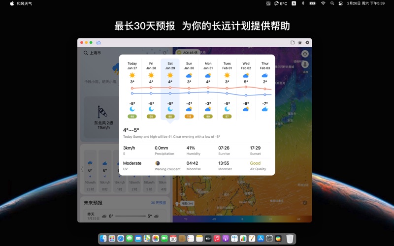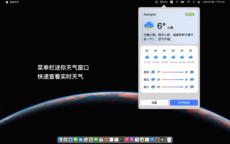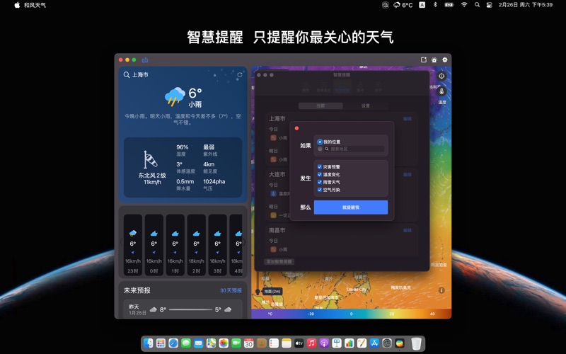 和风天气高级版for macOS~全球可视化、高精度、智慧型天气APP,并且没有广告,没有内购~ 请注意:和风天气高级版for macOS为一次性购买,仅限macOS中使用,如果你需要同时在iOS/iPadOS/macOS中使用高级版功能,请改为下载并订阅和风天气APP https://apps.apple.com/cn/app/id1461458147 和风天气高级版for macOS支持: 1.全球天气地图:温度、气压、云量、风、气象雷达等以可视化形式展现给你,直观的感受全球各类天气状况趋势。 2.智慧提醒:完全根据你的习惯设置的天气预报,可针对不同城市不同天气进行提醒,减少无用信息。 3.支持macOS小组件 4.支持菜单栏显示当前或指定城市的实时温度和天气状况 5.支持iPhone/iPad/Apple Watch和Mac多端数据同步 6.丰富的天气:灾害预警、逐天和逐小时预报、实况天气、空气质量、降水量、大气压、相对湿度、能见度、日出日落、月升月落等等等等... 需要开发天气应用?访问 https://dev.qweather.com 技术支持:support@qweather.com Bug修复:在macOS 14中小部件有可能无法正常工作