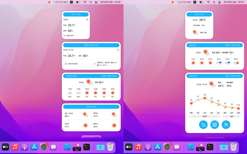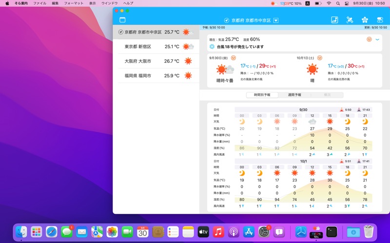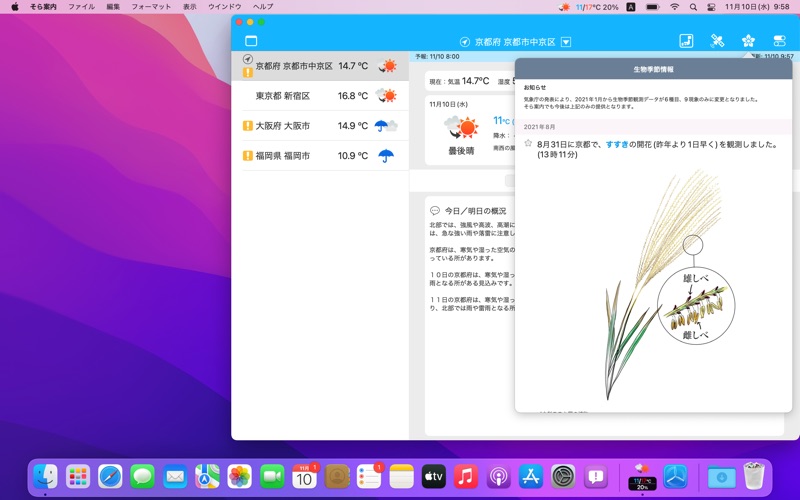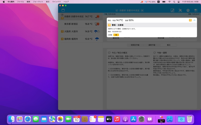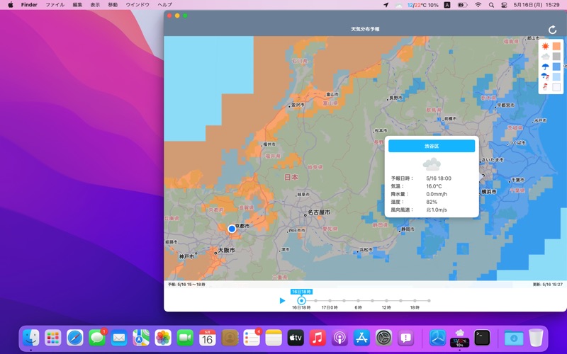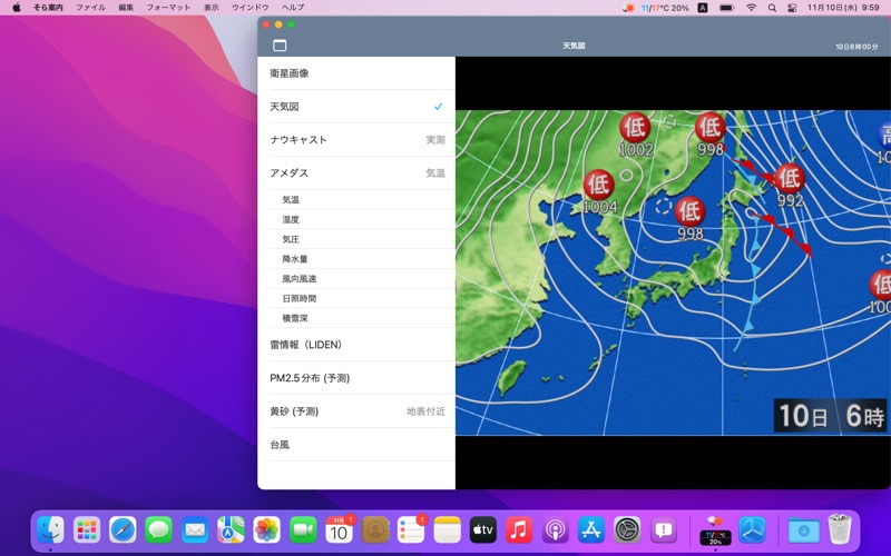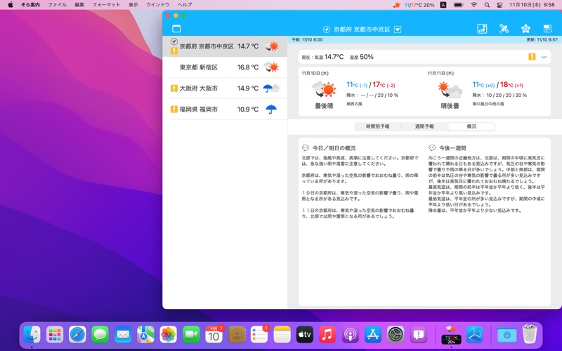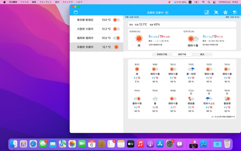 そら案内は、日本気象協会が提供する気象情報に基づき国内各地の天気予報を表示するアプリケーションです。 デスクトップの作業領域を邪魔しないシンプルなメニュー表示とDock表示、メニューからの一望性高い詳細表示。全ての国内macOSユーザにお勧めできる安心の国産天気予報アプリです。 ■ 特徴 - 市区町村を登録するだけのシンプル設計(GPS現在位置登録や郵便番号検索も可能) - グラフ表示で気温の高低を分かり易く表示(前日グラフとの比較も可能) - 作業領域を全く邪魔しない表示 - カレンダー連携(予報を標準カレンダーに出力) ■ 表示情報の種類 - 市区町村単位での天気予報 - 向こう14日間分の天気予報 - 直近2日間は1時間ごと/3時間ごとの詳細な気象情報(気温/降水確率/降水量/湿度/風向/風速) - 今日・明日、及び一週間先の概況文 - 現在の気温・湿度やその日の主要な情報をヘッドラインとして最上部に表示 - 雨雲レーダー(5分ごとの雨雲予測を1時間先まで表示) - 天気分布予報(今日・明日の3時間ごとの天気予報を5kmメッシュで地図上に表示) - 花粉予報(花粉シーズンのみ) - 熱中症情報(WBGT値)、熱中症警戒アラート - 天気画像(気象衛星、天気図、アメダス各種情報、雷情報、推計気象分布(気温)、解析積雪深、PM2.5予測、黄砂予測、台風、花粉予測) - 注意報・警報・特別警報 - 生物季節情報 - ウィジェット:天気予報、降水確率、気温。3時間ごとの天気と気温予報をグラフ表示、ヘッドライン表示、登録地域の予報表示 - ダークモード対応 - 雨雲レーダーが進化し5分ごとに最大1時間先までの雨雲の動きが確認できるようになりました - ツールバーから雨雲レーダーを直接表示することができるようになりました - 内部処理を改善しました - 外部ライブラリを更新しました