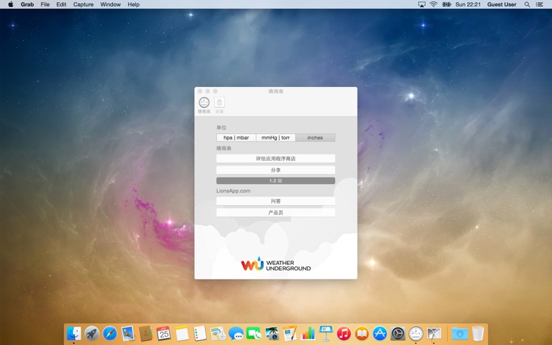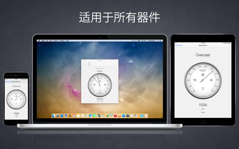 请确保您有一个WiFi连接到互联网。此时,应用程序将检测您的位置。显示器将显示的位置和大气压的名称,也指示气候条件。这些数据是由apixu.com可靠的气象服务提供 [ 点评 ] 古朴典雅的***** 这个程序是符合所有这就是最好的苹果。素雅为您提供需要了解大气压力的一切。我希望它可能在未来提供一个趋势栏显示在一段时间和工作日的变化压力变化率是非常重要的预测天气前线的方法。谢谢 [ 特点 ] •气压的实时测量 •支持的单位是百帕,毫巴,毫米汞柱,托,英寸 •在其使用的可靠性 •跟踪最后气压读数 •为Retina显示屏直观的图形优化 •易于使用 [ 配伍 ] 的.macOS 11.0 及更高版本。 晴雨表也可为iOS ( iPhone,iPad和iPod touch上) 。 [ 支持的语言 ] •英语,意大利语,西班牙语,法语,德语,葡萄牙语,荷兰语,俄语,中国,日本,丹麦,芬兰,挪威,波兰和瑞典。 [ 技术支持 ] 如果您需要帮助,请与我们联系info@lionsapp.com ,或访问我们的官方网站www.lionsapp.com 如果你喜欢的应用程序,别忘了给我们在App Store的审查。 + macOS Ventura 支持 + 修复了 macOS Ventura 中的气压计动画问题