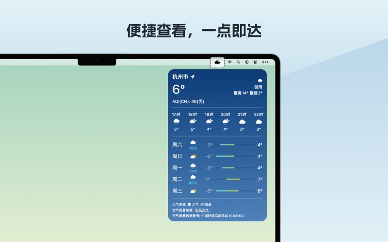 《积墨天气》— 你的Mac天气速递专家 快来试试《积墨天气》,你的Mac上最快捷的天气提示小管家!想要零打扰、秒查天气?就这么简单: - 点击菜单栏,即时呈现晴雨动态。 - 无广告,清爽体验。 - 定时播报,主动更新,不错过任何天气变化。 就是这么直接,就是这么贴心。下载《积墨天气》,让查天气变得像呼吸一样自然! - 支持添加更多城市 - 支持设置默认城市 - 体验优化