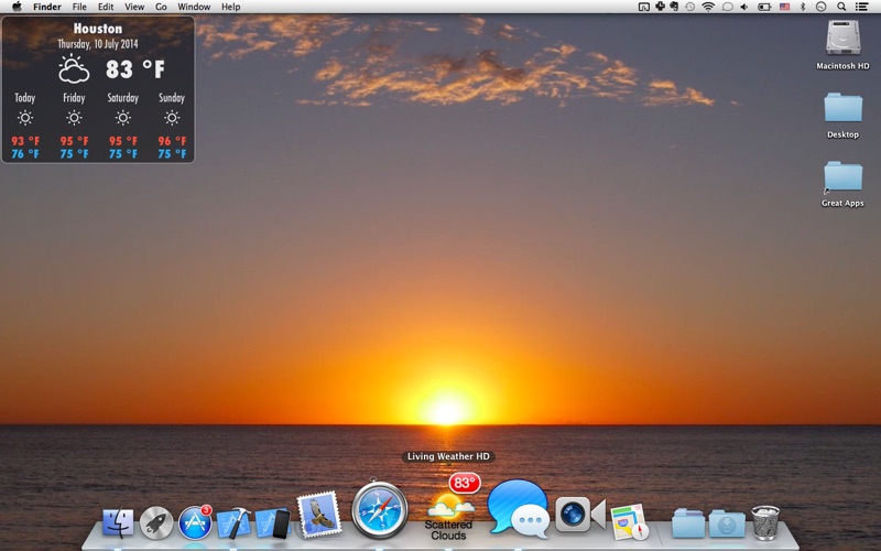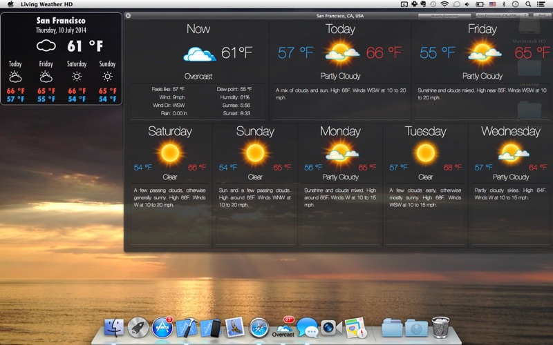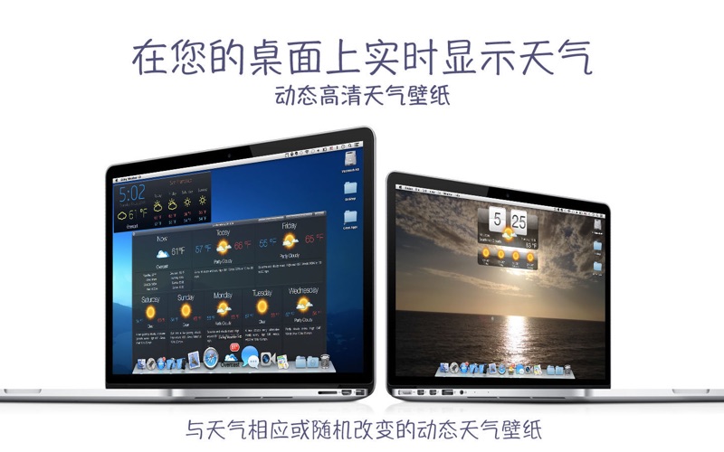 介绍天气HD——这款独特的非凡应用程序将天气呈现在您的桌面上! 它能够预报天气状况,并在桌面上使用相应的美丽动态壁纸场景。 天气HD也可以用作屏保。 主要功能: ● 在桌面上了解世界各地当前的天气状况和未来状况 ● 与当前天气状况、今天或明天预报相应的动态天气壁纸场景。您还可以选择自己喜欢的天气壁纸场景或让其随机显示。 ● 动态天气壁纸: ・场景与当前天气状况、今天或明天的预报相匹配 ・可选择自己喜欢的天气壁纸场景 ・可选择让壁纸场景随机改变 ● 详细的天气预报窗口,在Dock图标上点击一下即可打开 ● Dock图标显示天气: ・图标显示当前温度、风速或“体感”温度 ・天气状况图标 ・天气状况文本 ● 可调的桌面天气小工具: ・小工具样式——5种不同样式可选 ・在屏幕上的位置——移动到桌面上任意位置 ・尺寸——随心所欲地设置大小 ・透明——将其设为透明 ● 通过地址、机场代码或自动位置探测搜索预报地点 ● 保存多少地点都可以 ● 屏保选项(“显示桌面”功能将所有其他窗口移开) ● 预报和天气状况每隔60分钟更新一次 功能: ● 世界各地准确的天气预报和当地时间 ● 您的首个地点将被自动探测出,您还可以通过在搜索栏输入城市名、邮编或机场代码的前几个字母来添加新预报地点 ● 当前温度作为图标显示在桌面上 天气预报详情: ● 7天详细的天气预报 ● 3天内每隔2小时的天气预报 ・温度 ・风速和风向 ・湿度 ● 天气预报文本概要 ● 最低和最高温度 ● 当前“体感”(体表)温度 ● 风速和风向 ● 露点 ● 湿度 ● 降雨信息 ● 当地日升日落信息 ● 单位:华氏温度或摄氏温度和英里每小时或千米每小时 ● 时间格式:“系统默认”,12小时或24小时 立即下载天气HD! + 错误修复:我们修复了一些小错误,以确保更流畅的体验。 + 性能提升:增加了一些小的改进,以提升应用的响应速度。 您的支持和反馈对我们至关重要。感谢您的陪伴!
