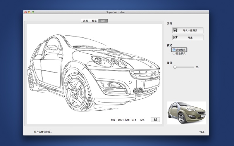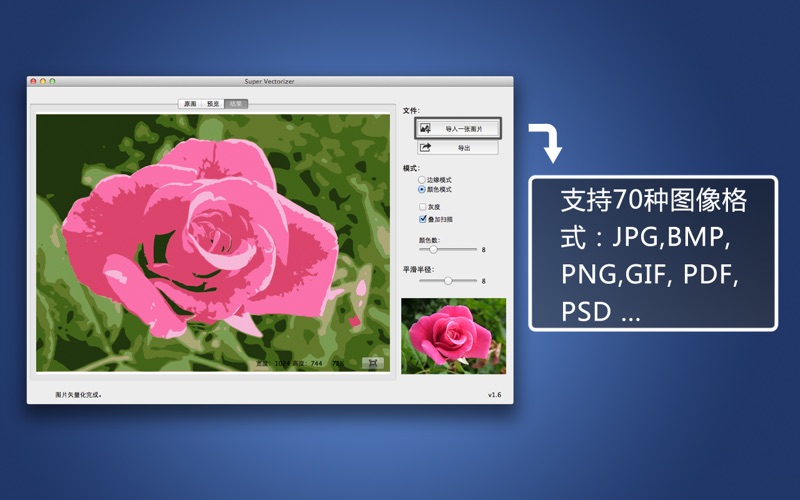***限时促销。原价210元。 ***不要错过“超级抠图”,一键抠图工具,从此告别PS的蜗牛抠图。现正半价促销。需要的快下手! 图片矢量化Super Vectorizer是一个好用的位图矢量转换工具。用户可选择相应的转换级别,由Super Vectorizer进行自动识别和分析,从而达到自已所需的效果。支持JPG, GIF, PNG, BMP, TIFF 到AI,SVG和PDF 的格式转换。除了精确的把位图转换为矢量图片,还可以轻松修复图片边缘的锯齿,让图片边缘更加圆滑,因此也可以利用Super Vectorizer不失真放大图片 Super Vectorizer支持导入众多的图像格式: JPG,BMP,PNG,GIF,PDF,PSD,PNT,RGB,ARW,BMPF,CUR,CRW,CR2,DCR,DNG,EPSF,EPSI,EPI,EPS, EXR,EFX,ERF,FPX,FPIX,FAX,FFF,GIFF,G3,HDR,ICNS,ICO,JP2,JFX,JFAX,JPE,JFIF,JPF,MPO,MAC, MRW,MOS,NRW,NEF,ORF,PICT,PIC,PCT,PS,PNTG,PNGF,PEF,QTIF,QTI,RAW,RAF,RW2,RWL, SR2,SRF,SRW,SGI,TRIC,TIFF,TGA,TARGA,TIF,XBM,3FR,8BPS 图片矢量化Super Vectorizer用于个人和专业项目,无论你是一个业余爱好者或平面设计公司都适用。它可以自动追踪导入的图像格式,并可选择根据图像边缘或者彩色或者灰度进行矢量化,输出高品质的矢量文件。Super Vectorizer将有效协助任何需要做大量矢量图像的人,从而使工作变得更加富有成效。 主要特点: • 简单易用。一键即可开始矢量化。 • 自动导入众多的图像格式(PNG,JPG,BMP等)。 • 可以选择图像边缘或者彩色或者灰度进行矢量化。 • 更好精确度,更接近输入的图像。 • AI,SVG和PDF矢量输出 反馈: 任何建议将不胜感激,支持邮箱:market@effectmatrix.com * “Super Vectorizer 2”,一键位图转AI,SVG和PDF矢量图,限时5折优惠! * 限时赠送:今天购买“超级抠图 Super PhotoCut”的用户,将会免费得到一份价值120元的"无损图片压缩Photo Size Optimizer"的正版软件,可以修改图片尺寸并无损压缩图片大小,终身使用。请发邮件及购买记录到market@effectmatrix.com 获取免费注册码,需要看到购买日期,谢谢。