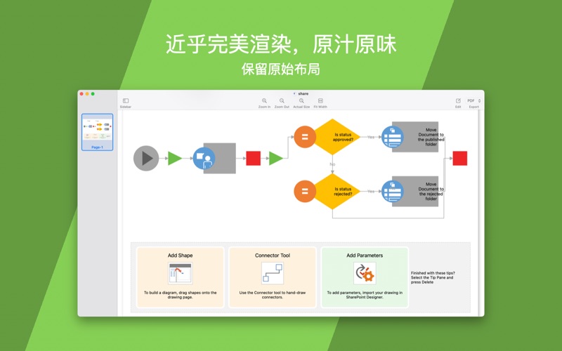 Visio Viewer for Mac 是一款专为 macOS 用户设计的轻量级应用,支持直接打开和查看 Microsoft Visio 文件(.vsdx 格式)。无需安装 Visio 或虚拟机,即可在 Mac 上快速浏览绘图、流程图、组织结构图等 Visio 内容,同时支持将文档导出为常用格式,满足日常办公与协作需求。 核心功能: • 无缝打开 .vsdx 文件:原生支持 Visio 文档渲染,保留原始布局、图层和形状。 • 多种导出格式:支持将文档导出为 PDF、PNG、JPEG 等格式,方便分享与打印。 • 简洁直观的界面:专注于查看体验,无复杂操作,轻松缩放、滚动浏览多页文档。 • 高效性能:针对 macOS 优化,加载迅速,运行流畅,兼容 Intel 与 Apple Silicon 芯片。 适用场景: • 快速预览 Visio 图纸或流程图 • 将 Visio 内容转换为通用格式用于演示或归档 • 团队协作中无需依赖 Windows 环境即可查看设计稿 简单、轻便、即开即用——Visio Viewer for Mac 让 Visio 文档查看不再依赖特定平台,提升工作效率! Terms of Use: https://www.apple.com/legal/internet-services/itunes/dev/stdeula/ 修复了一些bug