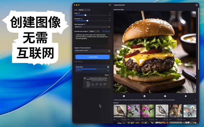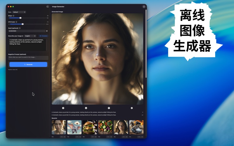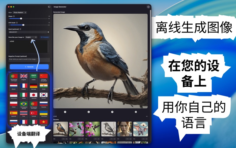直接在您的Mac上将文字转化为令人惊叹的视觉艺术。本应用由最先进的Stable Diffusion XL模型驱动,提供私密和专业级的图像生成体验。 为什么选择这款应用?与云端服务不同,本应用使用Apple Neural Engine在您的设备上本地运行。这意味着您的提示词完全保持私密——不会向外部服务器发送任何数据。 主要功能: 高保真生成:使用SDXL模型创建详细的1024x1024图像。 专业控制:通过可调节的步数(1-100)、CFG比例和Seed控制来微调您的结果。 负面提示:排除不需要的元素(如"模糊"或"低质量")以确保清晰的结果。 历史和管理:自动将您的生成保存到"最近"图库。一键轻松重用以前图像的设置。 原生性能:针对macOS优化,具有简洁的深色模式界面。 模板:通过内置的提示词模板快速获得灵感。 无论您是设计师、艺术家还是爱好者,都能在几秒钟内将想象力变为现实。 App内购买: 免费版包含每日有限的生成次数。通过Premium订阅或一次性Lifetime购买解锁无限图像生成。 隐私政策:https://offgen.framer.website/privacy-policy 使用条款、EULA:https://offgen.framer.website/terms-of-use-eula