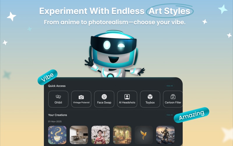 使用 AI 照片编辑器和图像生成器,释放您的无限创意。这款终极一体化创意工作室由新一代人工智能驱动。无论您是想像专业人士一样编辑照片、美化人像,还是想根据文本生成惊艳的 AI 图像,这款应用都能为您提供无限可能——所有功能都集成在一个易于使用的平台上。 只需轻轻一点,即可使用智能 AI 工具自动调整光线、移除背景、修饰面部并应用艺术滤镜,瞬间美化您的照片。借助深度学习驱动的高级照片增强功能,您可以修复旧照片、锐化模糊照片,并让每个细节都栩栩如生。该应用的智能算法即使是新手也能轻松编辑出专业级效果,无需任何设计技能。 使用 AI 图像生成器,将您的想象变为现实。只需输入您的想法,即可在几秒钟内将其转化为令人惊叹的艺术作品。创作奇幻角色、风景、产品概念、徽标、社交媒体视觉素材等等,所有作品都由 AI 为您量身打造。从写实、动漫、数字绘画、3D渲染、水彩和抽象等多种艺术风格中进行选择,打造真正独一无二的作品。 主要功能: AI照片编辑:即时自动增强、修饰和美化您的照片。 AI背景移除:精准完美地替换或模糊背景。 AI图像生成器:利用尖端的生成式AI技术,根据文字提示创建高质量图像。 AI人脸编辑器:自然地柔化肌肤、提亮双眼并优化面部特征。 艺术滤镜和特效:将照片转换为数字绘画、素描或电影级视觉效果。 照片修复:以惊人的细节恢复能力修复损坏或低质量的照片。 自定义AI风格:以不同的艺术模式和创意美学生成独特的视觉效果。 高清导出:以高分辨率保存和分享您的作品,用于打印或社交媒体。 无论您是摄影师、设计师、网红,还是仅仅喜欢尝试各种视觉效果,AI照片编辑器和图像生成器都适合您。从快速编辑到全面艺术创作,这款应用将科技与创意完美融合,带来流畅的使用体验。 加入数百万创作者的行列,探索图像编辑的未来。立即下载 AI 照片编辑器和图像生成器,开启由 AI 驱动的超乎想象的视觉创作之旅。 注意: 付款将在确认购买时从您的 iTunes 帐户扣除。订阅将自动续订,除非您在当前订阅期结束前 24 小时取消自动续订。续订费用将在续订前 24 小时内按原订阅价格收取。您可以在购买后于帐户设置中管理和取消自动续订。详情请参阅服务条款和隐私政策。 隐私政策 https://sites.google.com/view/aqib-aiimageeditor/privacy-policy 服务条款 https://sites.google.com/view/aqib-aiimageeditor/terms-conditions - 提升 AI 图像质量,呈现更清晰、更细腻的艺术作品 - 更快的生成速度 - 探索更多创意风格 - 修复漏洞并提升性能