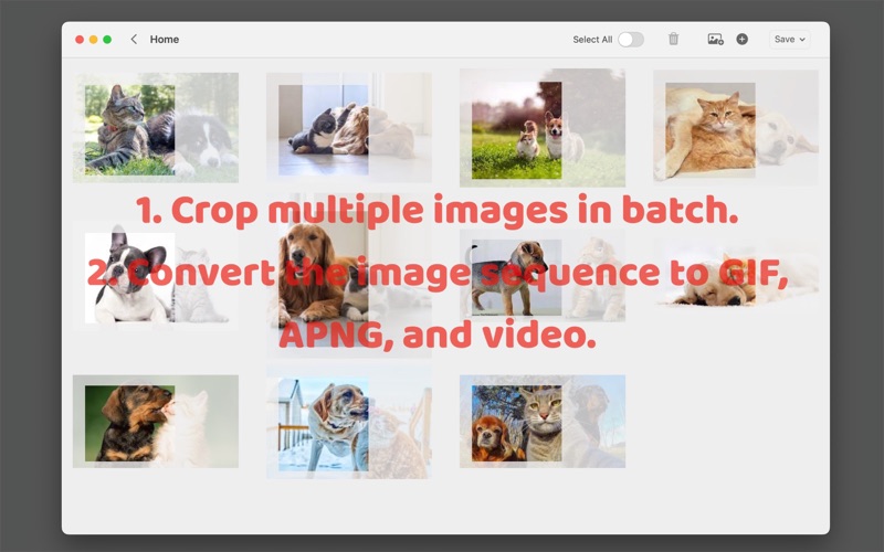 您可以一次裁剪多张图片,只需两个步骤:1. 设置裁剪边距,2. 点击保存按钮。 轻松批量裁剪图片。(免费) 将图像序列转换为APNG。(免费) 将图像序列转换为视频。(免费) 将图像序列转换为GIF。(应用内购买) 操作简单,易于使用 1. 将图片拖放到应用程序中。 2. 调整裁剪区域。 3. 保存裁剪后的图片。 帮助与反馈: 如有反馈,请通过reportissue@yeah.net与我们联系。 修复了已知问题。