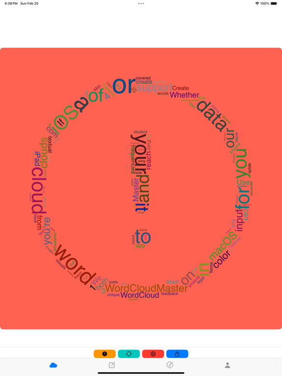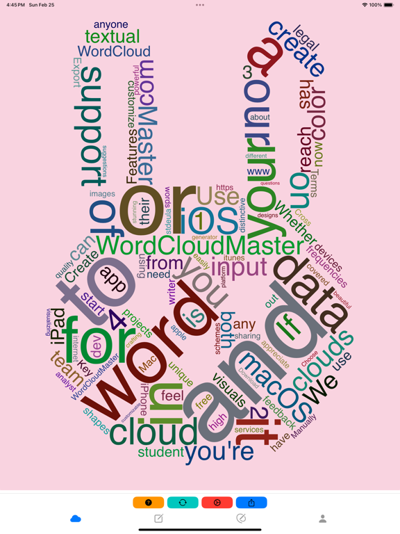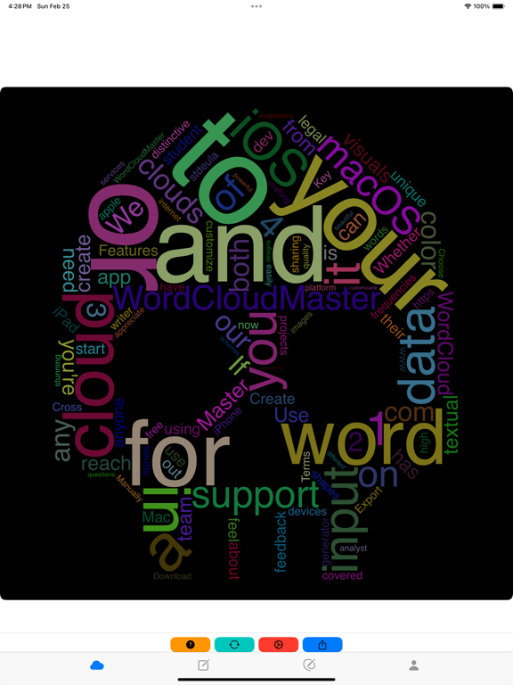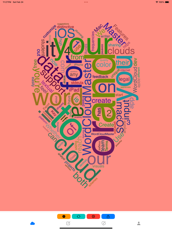 为什么选择词云图大师(WordCloudMaster) ? • 自定义模板:通过个性化您的模板来满足您的独特需求。 • 海量字体:超过1700种字体可供选择,美化词云字体风格。 • 海量模板库:11000个模板,同时仍随用户需求不断增长,满足各种定制需求。 • 无缝视频录制:以令人惊叹的高清视频捕捉整个词云渲染过程。非常适合展示您的创作或与他人分享。 • 动态GIF动画:将词云渲染过程转换为引人注目的GIF动画。非常适合快速共享和具有视觉吸引力的展示。 • 增强的停用词处理:从文本或文章中提取关键信息时自动过滤掉常见停用词,确保数据更加精确和相关。 • 透明背景:支持词云图背景颜色透明度调整,满足更多风格定制需求。 • 快速文本提取:快速提取和可视化来自各种文本源的数据。 • 精准关键词调整:微调关键词和词频,实现完美定制。 • 数据导入/导出:通过导入和导出功能无缝管理大量数据。 • 轻松图像导出和复制:轻松将文字云导出为图像或将其直接复制到剪贴板以供即时使用。 • 跨平台兼容性:享受跨各种平台的灵活性和可访问性。 在哪里使用词云图大师(WordCloudMaster) ? • 营销活动:为宣传材料、广告和社交媒体帖子创建引人注目的文字云,以吸引受众并有效传达您的信息。 • 教育项目:通过具有视觉吸引力的文字云增强课堂演示、学习材料和教育海报,使学习互动且有趣。 • 业务报告:可视化业务报告、提案、PPT 和演示文稿中的关键数据和见解,使复杂信息更易于访问和理解。 • 社交媒体内容:为您的社交媒体资料、帖子和故事设计独特且可共享的文字云,以提高参与度和影响力。 • 数据分析:以易于理解的视觉格式分析和呈现文本数据,非常适合数据科学家、研究人员和分析师。 • 创意项目:通过将文字云集成到图形设计项目、艺术品和个人项目中,将您的创意变为现实。 • 活动邀请函:为活动、聚会和聚会制作精美的文字云邀请函,增添个人风格并给您的客人留下深刻印象。 • 客户反馈可视化:以视觉上引人入胜的方式显示客户反馈和评论,以识别关键趋势和情绪。 • 书籍和电影摘要:将书籍、电影和其他内容总结为引人入胜的词云,突出显示关键主题和概念。 • 团队建设活动:在团队建设练习中使用文字云来直观地表达团队想法和讨论。 • 公开演讲和演示:使用强调要点并吸引观众的文字云来增强演讲和演示。 • 服装和商品设计:为T 恤、连帽衫和其他商品创建独特的文字云设计。 • 婚礼和活动装饰:为婚礼、派对和特别活动设计文字云装饰。 • 礼品定制:个性化礼品,例如带有文字云的杯子、海报和卡片。 • 房地产营销:使用文字云来突出显示房地产列表和广告中的主要特征。 • 餐厅菜单:为餐厅创建具有视觉吸引力的文字云菜单和宣传材料。 • 产品包装:为产品包装设计醒目的文字云图形。 • 健康和健身计划:在健康和健身计划中使用词云来激励和鼓励用户。 • 公司新闻通讯:在公司新闻通讯中使用词云来总结和突出重要信息。 • 旅游指南:创建词云旅游指南,展示目的地的主要亮点和活动。 • 图书馆和书店展示:在图书馆和书店展示中使用词云来推广新书和热门书籍。 • 会议和研讨会材料:在会议和研讨会材料中使用词云来总结关键讨论点和结论。 • 个人博客和网站:为个人博客和网站创建引人入胜的词云,以增加视觉吸引力和用户参与度。 • 音乐和播放列表:创建音乐和播放列表的词云,展示歌曲和艺术家的关键元素。 • 社交活动和聚会:在社交活动和聚会中使用词云来展示活动主题和参与者信息。 • 品牌推广:在品牌推广材料中使用词云以增加品牌的可见度和吸引力。 • 广告设计:在广告设计中使用词云来突出产品或服务的独特卖点。 • 网页设计:在网页设计中嵌入词云以增加互动性和视觉吸引力。 • 新闻报道:在新闻报道中使用词云来可视化重要的关键词和主题。 • 公益宣传:为公益活动创建词云以提高公众的参与度和意识。 • 员工培训:在员工培训材料中使用词云来突出重要的学习点和主题。 • 会议记录:在会议记录中使用词云来总结和展示讨论的要点。 • 市场研究:在市场研究报告中使用词云来展示消费者反馈和趋势。 • 社群建设:在社群建设活动中使用词云来促进成员间的互动和交流。 • 视觉数据呈现:在数据可视化项目中使用词云来展示数据中的重要模式和趋势。 • 新闻通讯:在新闻通讯中使用词云来总结和突出主要内容。 • 故事板:在创作故事板时使用词云来整理和展示主要情节和元素。 • 活动标识:为活动创建独特的词云标识,增加活动的独特性和吸引力。 • 宣传海报:在宣传海报设计中使用词云来突出重要信息和主题。 • 课程开发:在课程开发中使用词云来总结和展示课程内容和关键点。 • 小说创作:在小说创作中使用词云来可视化角色、场景和情节要素。 • 技术文档:为技术文档创建词云,以突显关键术语和概念。 • 食谱:为食谱创建词云,展示主要成分和步骤。 • 用户评论:在网站和产品页面上展示用户评论的词云,以突出常见反馈。 • 心理健康:在心理健康计划中使用词云来展示积极的确认和情感表达。 • 天气报告:为天气报告创建词云,展示主要天气条件和预报。 • 语言学习:在语言学习中使用词云来帮助记忆和复习单词和短语。 • 电子