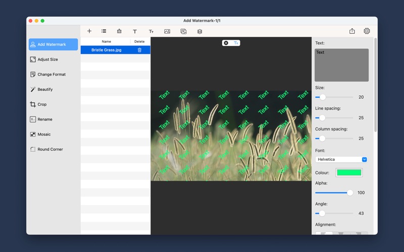 这是一款可以编辑图片,批量处理图片的工具。可以批量添加文字和图片水印,更改图片尺寸,批量裁剪图片,重命名图片,给图片添加马赛克等。 功能: 【1】添加文字水印,图片水印,可以更改文字的颜色、字体、阴影等。 【2】调整图片尺寸,支持自定义图片尺寸,按比例缩放图片。 【3】更改图片格式,支持导出的格式有:png,jpeg,bmp,tif,jp2。 【4】美化图片,更改图片的参数,如:亮度、饱和度、对比度、色调、曝光、锐度等。 【5】裁剪图片,可以设置裁剪图片的宽度、高度。 【6】重命名图片,用序列号命名图片,也可以用文字、时间和日期、尺寸设置图片名称。 【7】给图片添加马赛克,可以选择多种马赛克类型。 【8】给图片添加圆角和边框。 修复已知问题。