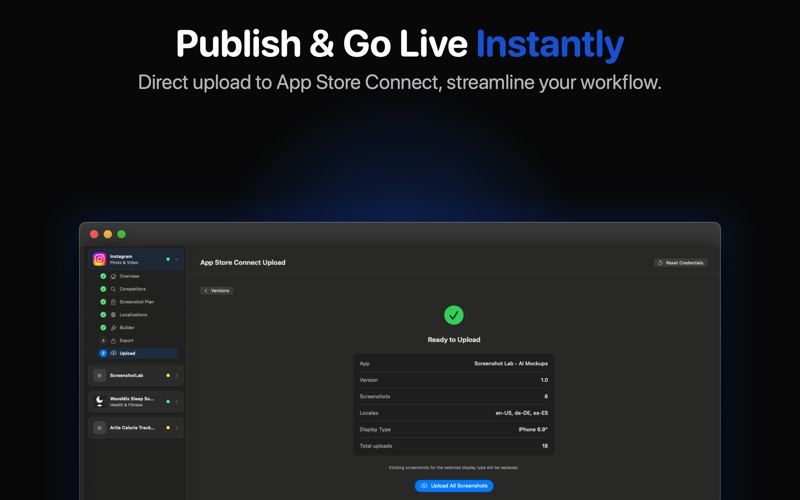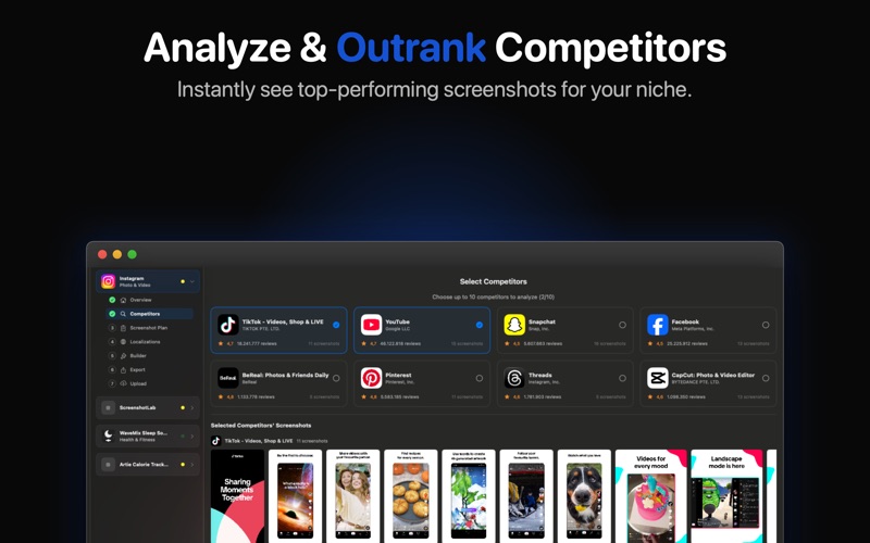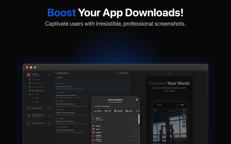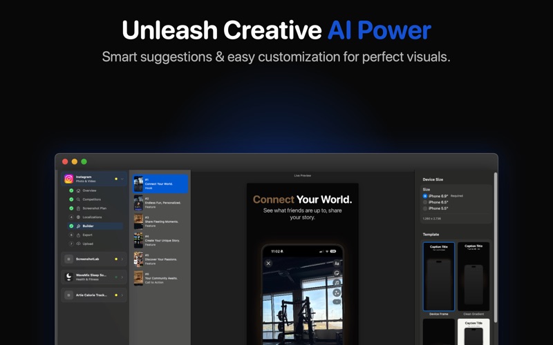 别再浪费时间在Figma里做截图了。Screenshot Lab是一款AI驱动的macOS应用,自动创建专业的商店截图。 为什么选择SCREENSHOT LAB? - 竞品分析 — 搜索任何应用,AI自动分析竞品截图策略 - AI生成文案 — 获取基于实际转化数据的ASO优化标题 - 智能本地化 — 不是直译,AI根据每种语言的搜索行为进行适配 - 原生macOS — 快速、离线可用的编辑器 - 一键导出 — 符合商店规格的PNG 使用方法 1. 将应用截图拖入Screenshot Lab 2. AI研究你的竞品 3. 从5个专业模板中选择 4. AI生成转化优化的文案 5. 支持30多种语言本地化 6. 直接导出或上传到App Store Connect 免费试用。升级Pro解锁无限项目和全部AI功能。 订阅信息 Screenshot Lab Pro 为自动续订订阅。 - Screenshot Lab Pro:每年 $9.99 - 确认购买时,系统将向您的 Apple ID 账号收费 - 订阅将自动续订,除非在当前期间结束前至少 24 小时取消 - 系统会在当前期间结束前 24 小时内向您收取续订费用 - 您可以在购买后前往账号设置管理和取消订阅 隐私政策:https://screenshotlab.app/privacy 使用条款(EULA):https://screenshotlab.app/terms Apple 标准 EULA:https://www.apple.com/legal/internet-services/itunes/dev/stdeula/