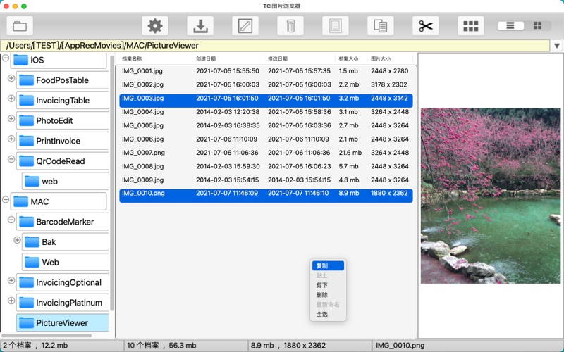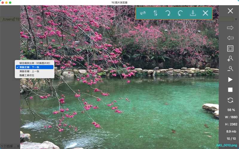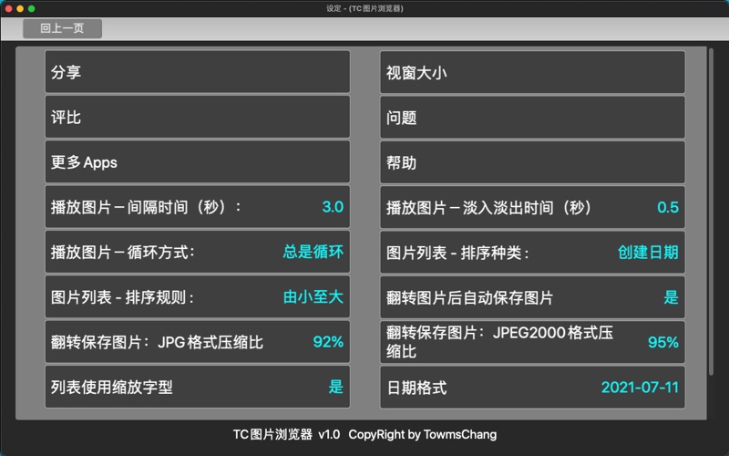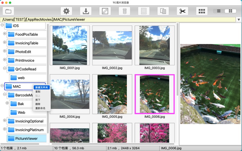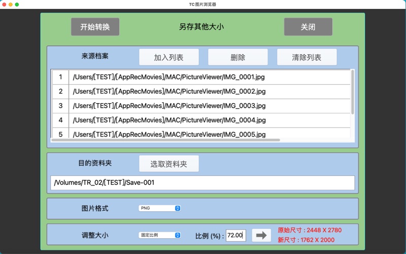- 档案浏览:资料夹 1.按滑鼠右键可跳出选单。 2.资料夹目录树状显示。 3.可新增资料夹并自定义其名称。 4.资料夹可作『剪下』『复制』『贴上』『删除』『更名』等功能。 5.介面颜色支持暗黑模式。 - 档案浏览:图片列表 1.支持图片种类:PNG,JPEG,JPG,JPEG2000 (JP2),GIF,BMP,TIFF。 2.可切换『资讯或缩图』列表显示。 3.可调整缩图的大小和每行的显示数量。 4.档案可作选取,滑鼠拖拉可多数选取,或按Command+点击档案或缩图做复选。 5.选取後可执行『剪下』『复制』『贴上』『删除』等功能。 6.档案更名:资讯模式时,点击档案,再点一次档案名称,等一秒即可作更名。 7.档案更名:缩图模式时,点击缩图,按滑鼠右键,选『更名』。 8.连续点2次档案或缩图或点击右侧之预览图,可跳出图片观看视窗。 9.支持自由调整『资料夹』『图片列表』『预览视窗』之宽度。 10.资料夹开启之历史记录功能。可依据历史纪录快速开启资料夹。 11.资料夹路径收藏功能。可将常用的资料夹路径加入收藏列表,快速开启资料夹。 - 图片观看 1.单键切换图片之适合萤幕大小,与图片之原始大小。 2.单键切换下一张或上一张图片,与图片放大缩小功能。 3.显示图片相关资讯。 4.支持滑鼠滚轮之图片放大缩小功能。 5.图片放大超过视窗大小,可使用滑鼠位移图片。 6.可隐藏工具栏,支持滑鼠快速切换下一张或上一张图片(滑鼠右键功能选单)。 7.可作图片连续播放,并可设置播放的间隔时间。 8.支持全萤幕显示。 9.GIF图片支持动画显示。 10.图片翻转:向右翻转90度,向左翻转90度,左右翻转,上下翻转。 11.图片翻转:可设置图片翻转後是否自动储存。 12.使用Finder时,支持用外部程序打开图片,支持多选图片传入并开启。 - 图片格式转换 1.支持转换图片种类:PNG,JPEG,JPG,JP2,GIF,BMP,TIFF。 2.JPG类型可选压缩比率。 3.多档选取: A:图片列表下,圈选多档案,按上方之图片格式转换,即可将选取之档加入转换列表。 B:按『加入列表』,选择欲转换之图片。 4.待转换之列表可作单列删除,或全部清除。 5.可以选择转换後要存储的文件夹。 6.支持多个文件的连续转换。 - 图片大小转换 1.操作方式同『图片格式转换』。 2.调整图片大小: A:固定大小,输入图片的宽度及长度。 B:固定比率:输入比率(%),100为原图大小,支持小数点,按右边之箭头可试算出转换後之图片大小(仅提示第一张之资讯)。 - 修正显示介面 (macOS Sonoma)。 - 新视窗图片:调整预设视窗大小。