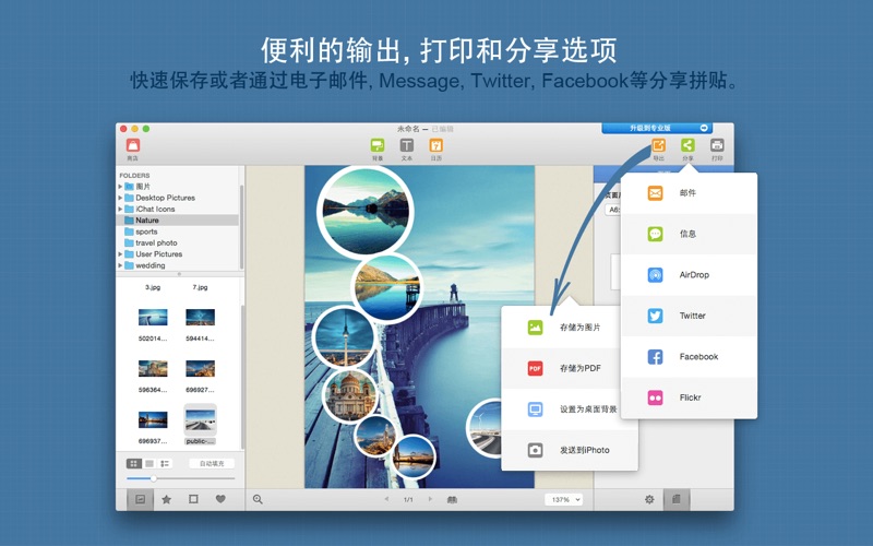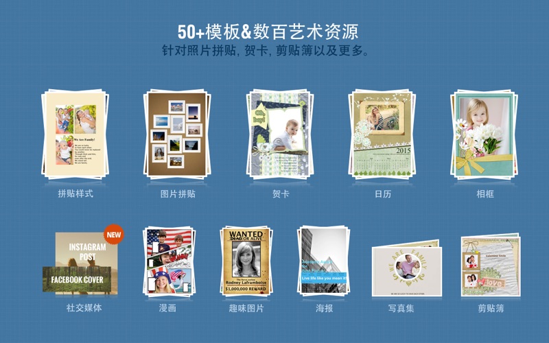 * * * #1图形和设计类免费应用软件金榜! * * * 拼贴大师3.5免费版是Mac OS X系统下一款功能强大且使用简单的照片拼贴制作工具, 它可以让您快速制作照片拼贴, 剪贴簿, 贺卡, 照片日历, 相册, 海报等. 让您将生活中的美好瞬间变成精美的照片拼贴和亲朋好友分享. 拼贴大师拥有超过40个精美模板,它可以让您将生活中的特别场合如生日、旅行、毕业礼、婚礼、婴儿、周年纪念日等各种节日的照片制作成精美的艺术品. 除此之外, 你还可以选择各种图片特效, 应用丰富的修饰物诸如剪贴画, 相框, 遮罩, 背景和文字让您的拼贴更加醒目. 您的佳作完成之后, 您可以输出拼贴, 打印, 或者通过电子邮件, Message, AirDrop, Twitter, Facebook以及Flickr跟家人和朋友分享. ----------------------------------------------- 用户体验 ----------------------------------------------- * 创建自制的照片拼贴和剪贴簿, 与家人和朋友分享. * 制作精美的卡片作为独一无二的礼物. * 用精美的相册永久记录最珍贵的记忆. * 制作个性化海报装饰您的房间, 用作活动宣传等. ----------------------------------------------- 突出特性 ----------------------------------------------- * 3.5新特性 • 全新的文字对象. • 全新的GUI. • 完美支持retina屏幕. * 40+专业模板以及丰富的资源供选择 • 提供40+专业模板. • 各种各样的模板可供您设计制作专业级的照片拼贴, 贺卡, 剪贴簿, 海报, CD封面, 照片日历和照片集等. • 适用于任何场合的各类型模板 - 旅行, 生日, 毕业, 婴儿, 周年纪念, 婚礼, 各种节日等等. • 提供50+背景资源, 240+剪贴画, 60+相框以及70+遮罩. * 用您的照片制作个性化拼贴 • 直接拖放照片添加到拼贴中. 直接从iPhoto, Aperture, Lightroom等导入照片. • 创建编辑多页面拼贴集, 制作包含许多页面的相册和剪贴簿. • 自如地复制页面并自定义页边距. • 轻点击几下鼠标移动, 旋转, 调整图片大小. • 裁剪照片让它更完美契合到所选相框空间. • 缩放编辑区, 预览拼贴极小细节. 您还可以在全屏模式下编辑拼贴. * 装饰拼贴 • 应用照片特效/滤镜, 倒影效果美化您的照片并且你可以简单地对图片颜色进行调节. • 使用各种背景图案, 制作精美的拼贴. • 为对象添加填充, 描边以及阴影等样式. • 应用相框, 遮罩, 剪贴画来增添拼贴艺术效果. • 添加并自定义文字 - 应用填充, 光晕等文字特效使其更加突出. • 添加日历, 制作个性化的照片日历. * 存储和分享拼贴 • 存储拼贴为图片格式– JPG, TIFF, BMP, PNG, GIF, PSD. • 存储拼贴为PDF 文件. • 直接导出拼贴到iPhoto. • 设置拼贴为桌面背景. • 通过Facebook和电子邮件与您的朋友和家人分享拼贴. Mac OS X 10.8系统下直接分享到iMessage, AirDrop, Twitter, Facebook, Flickr. • 直接打印拼贴. * 修正了一些小错误.
