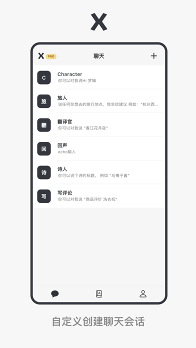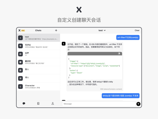 Chat X 是一款原生的AI聊天增强客户端。 通过Chat X你可以轻松的得到精准的问题回复,辅助你解决绝大多数的文字的问题。 Chat X支持自有App Key和免App Key充值服务。并且可自由切换App Key和充值扣费方式。 # 主要功能 1. 支持安装和自定义Prompt 2. 支持创建自定义聊天会话(可选择绑定Prompt) 3. 聊天会话列表和Prompt云同步 4. 支持推流(可随时中断节省Tokens) 体验 Chat X 的强大功能,让您的文本交互更上一层楼! 隐私政策:https://fastclip.app/policy/privacy-chatx.htm 服务条款:https://fastclip.app/policy/terms-chatx.htm 1. 优化聊天界面