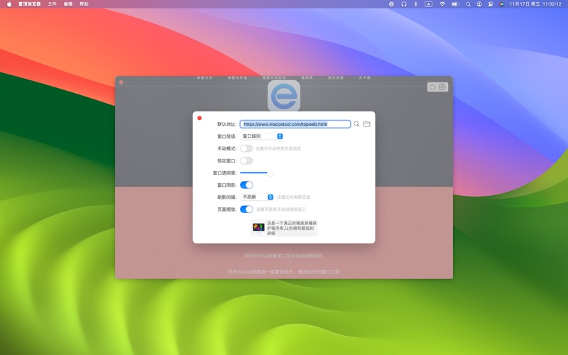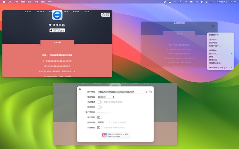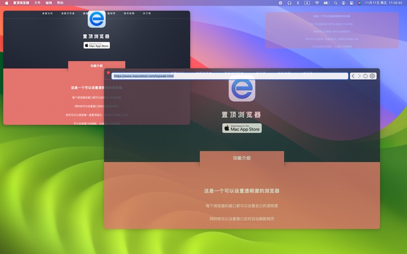这是一个可以设置透明度的浏览器 【功能介绍】 每个浏览器的窗口都可以设置自己的透明度。 同时你可以设置窗口定时自动刷新网页。 你还可以让浏览器一直置顶显示,悬浮在任何窗口之前。 可以去掉窗口的阴影,让他看上去更隐蔽。 锁定窗口后,他将忽略鼠标的事件,就像不存在一样… 你还可以加载本地的文件,比如图片,PDF,视频等等 【联系我们】 Email: macostool@qq.com B站: https://space.bilibili.com/404684311 修复了一些问题