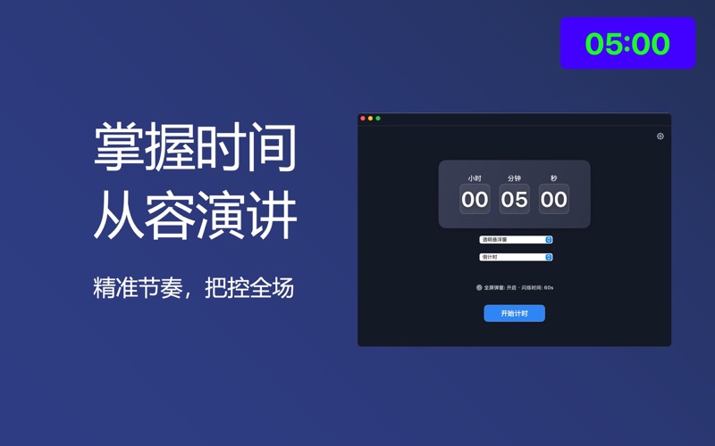 专为演讲设计的倒计时器 App,帮助你在 PPT 演示中更高效、更自信。 清晰的大字体倒计时,界面悬浮不挡内容,轻松掌控节奏 支持窗口置顶悬浮,随时查看时间状态 一键启动、暂停、重置,操作简单流畅 简洁美观的界面风格,适配多种主题场景 适用于演讲、答辩、课堂讲解、直播计时、视频录制等多种应用场景。 「清晰、专业、不打扰」——这就是你要找的演讲计时工具。 新增透明悬浮窗按钮自动隐藏