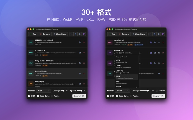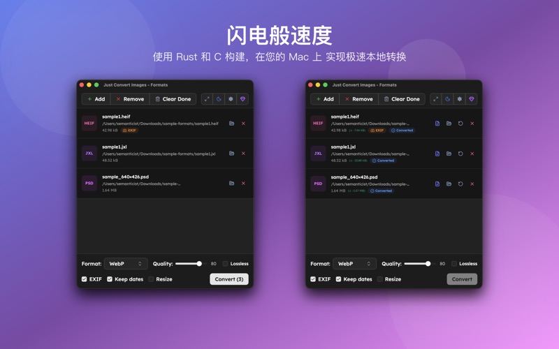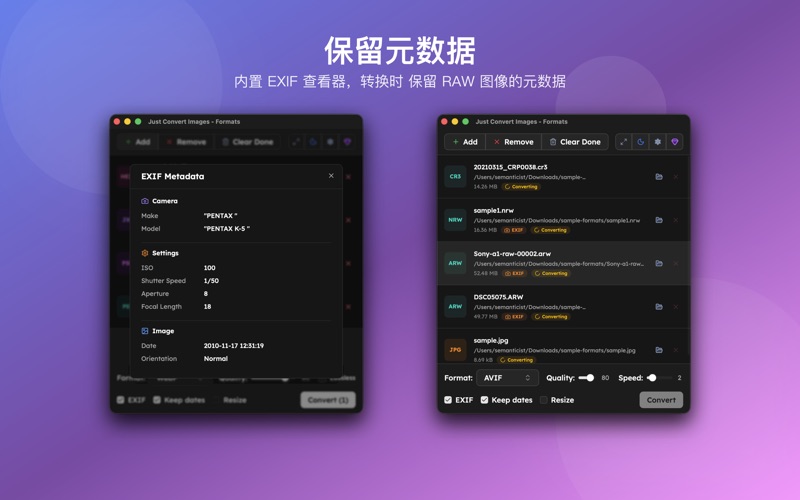 任何图片都能转换成您想要的格式。支持HEIC、WebP、AVIF、JPEG XL、RAW、PSD、PDF等35种以上格式。 - 100%离线 — 图片绝不会上传到外部服务器 - 批量转换 — 数百张照片也能一次处理完成 - 保留EXIF — 完整保留拍摄信息和位置数据 基于Rust和macOS原生API打造,快速又稳定。 支持格式: • 现代格式: AVIF, WebP, HEIC, JPEG XL • 标准格式: JPEG, PNG, GIF, BMP, TIFF • 专业格式: PSD, OpenEXR, JPEG 2000, PDF • RAW: Canon(CR2/CR3), Nikon(NEF), Sony(ARW), Fujifilm(RAF)等15种以上 主要功能: • 拖放即可添加多个文件 • 按格式精细调节画质 • 转换同时调整尺寸 • 可选保留或删除EXIF元数据 • 保持原文件的创建日期 免费版可转换5个文件。Pro版一次购买终身使用,无需订阅。 - 应用程序更名为"Confi" - 内部改进和错误修复